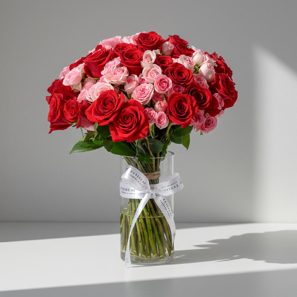 This striking Valentine’s bouquet brings together 30 premium red roses and 20 delicate pink spray roses, artfully layered with 15 fresh ruscus to create a lush, voluminous expression of passion and tenderness. Wrapped in four layers of soft cream wrapping and finished with a ZUVEES pink ribbon, the bouquet balances bold romance with gentle grace. Also available as an elegant cylinder glass vase presentation, this arrangement transforms love into a visual statement that feels both timeless and modern.