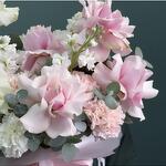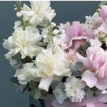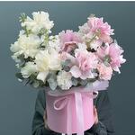 Eucalyptus - 2 pcs Box - 1 pcs carnation - 6 pcs white matthiola - 4 pcs white french roses - 3 pcs pink french roses - 4 pcs