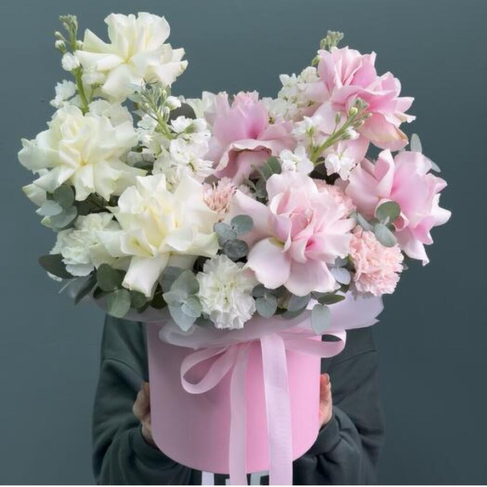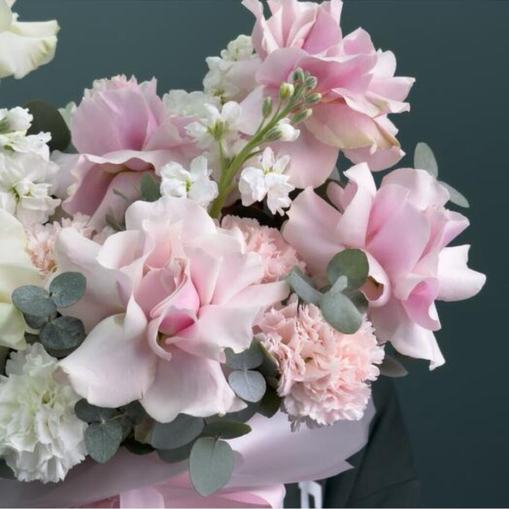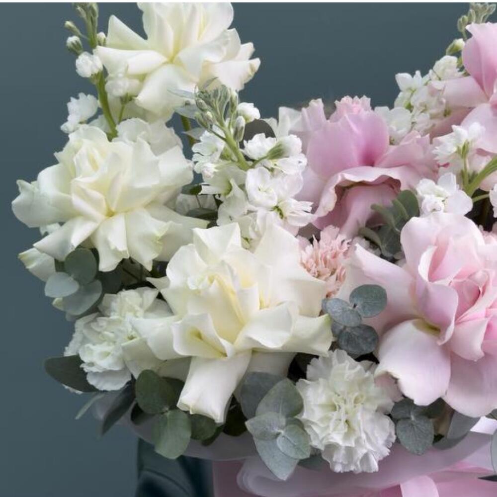 Eucalyptus - 2 pcs Box - 1 pcs carnation - 6 pcs white matthiola - 4 pcs white french roses - 3 pcs pink french roses - 4 pcs