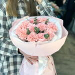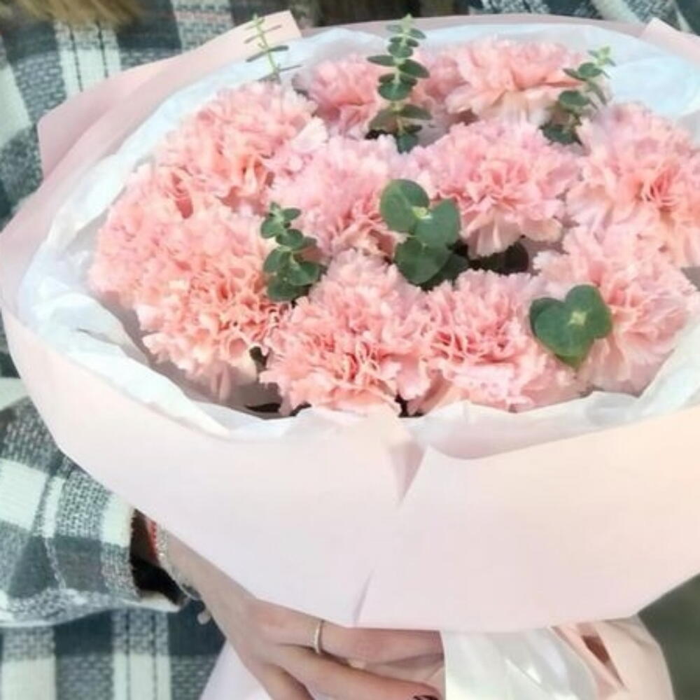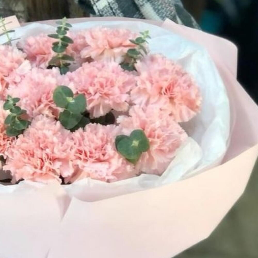 Indulge your senses with our Mono Bouquet composed of 11 enchanting dianthuses, alongside the refreshing scent of 5 stems of eucalyptus. Each stem is delicately wrapped in a chrysalis with a hint of a ribbon to give it an elegant touch. The bouquet is creatively arranged in a double packed box, carefully maintaining the freshness with an included water box. This bouquet is not just a gift, but a comforting experience.