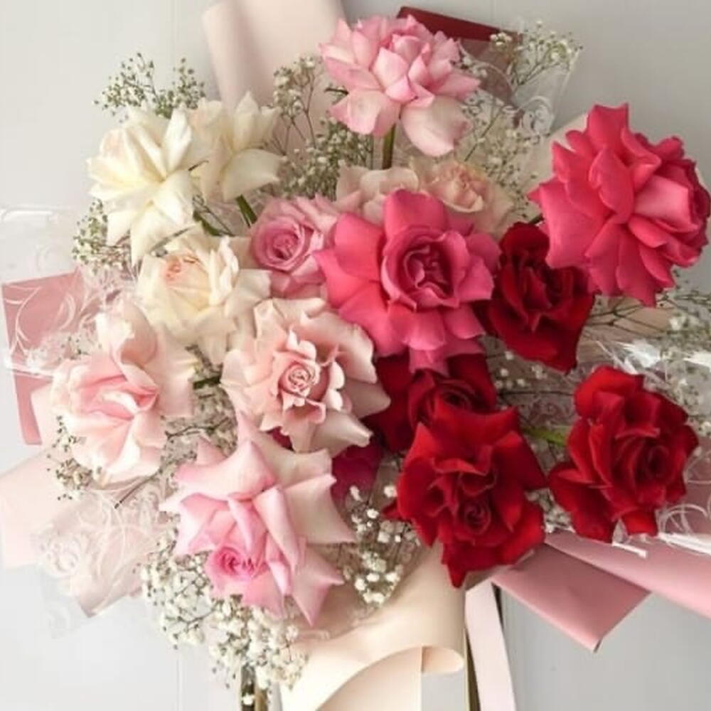 White rose - 3 pcs Gypsophila - 8 pcs pink mondial роза - 3 pcs wrapping paper - 6 pcs red ecuador rose - 5 pcs pink o'hara роза - 3 pcs deep pink ecuador rose - 2 pcs