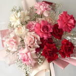 Gypsophila - 6 pcs pink mondial - 5 pcs wrapping paper - 8 pcs white ohara - 3 pcs red ecuador rose - 5 pcs deep pink ecuador rose - 2 pcs