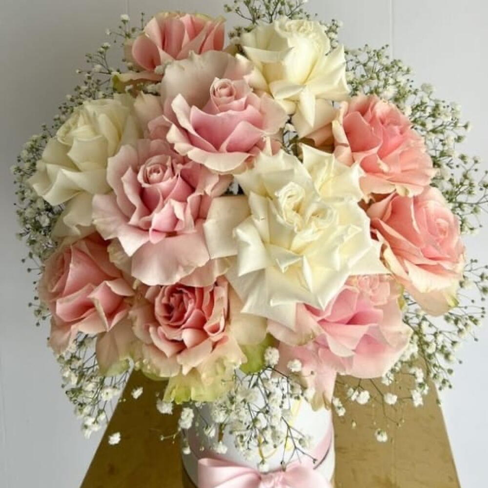 Gypsophila - 5 pcs box hat - 1 pcs white ecuador rose - 3 pcs pink ecuador rose - 8 pcs