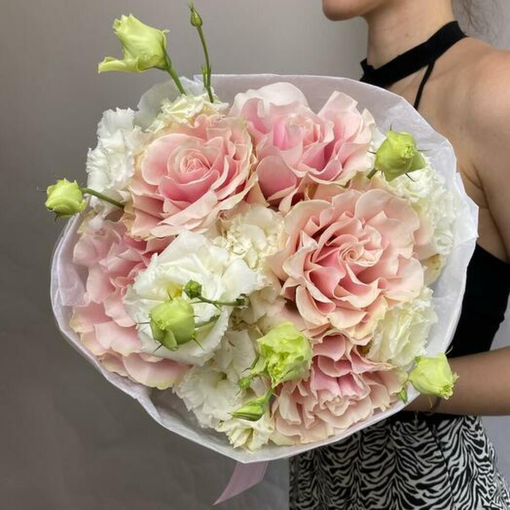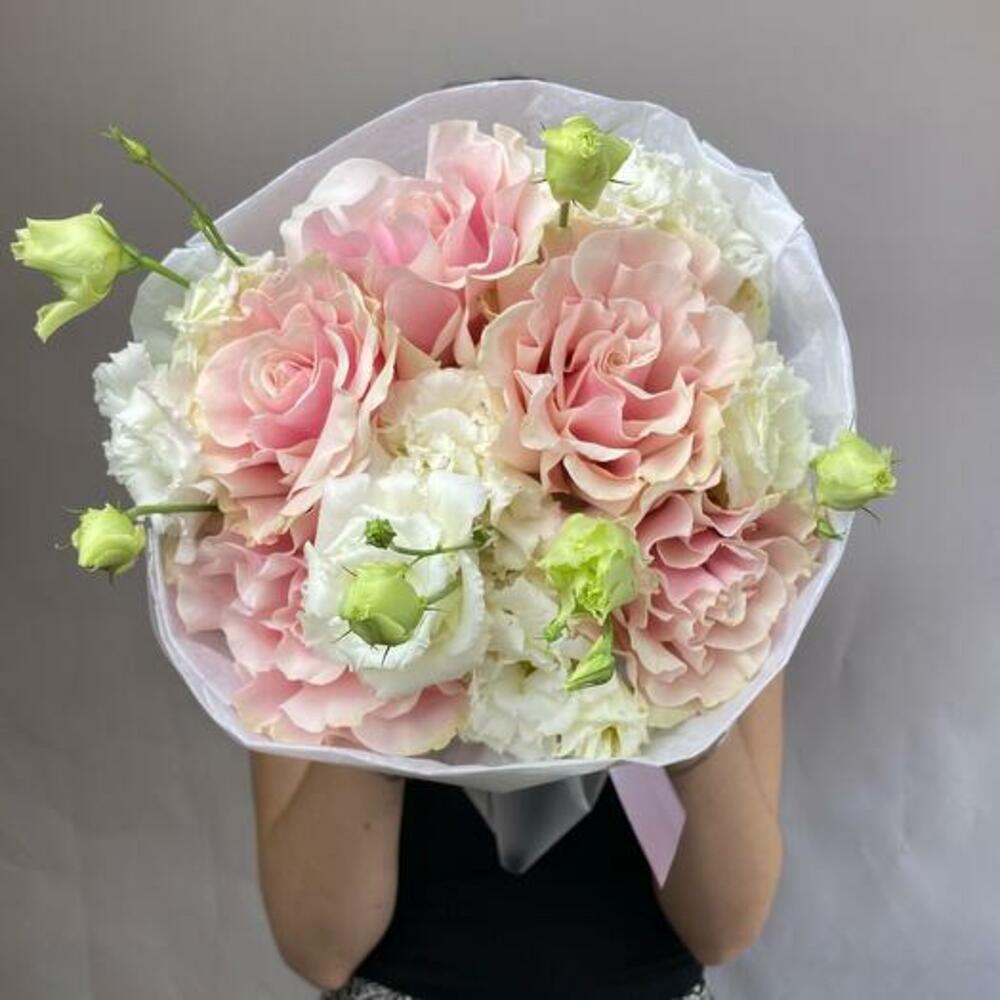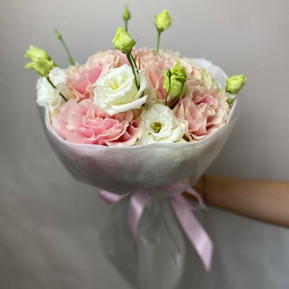 Satin ribbon - 1 pcs white eustoma - 7 pcs design packaging - 1 pcs french rose - 5 pcs