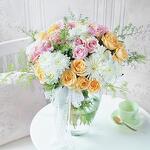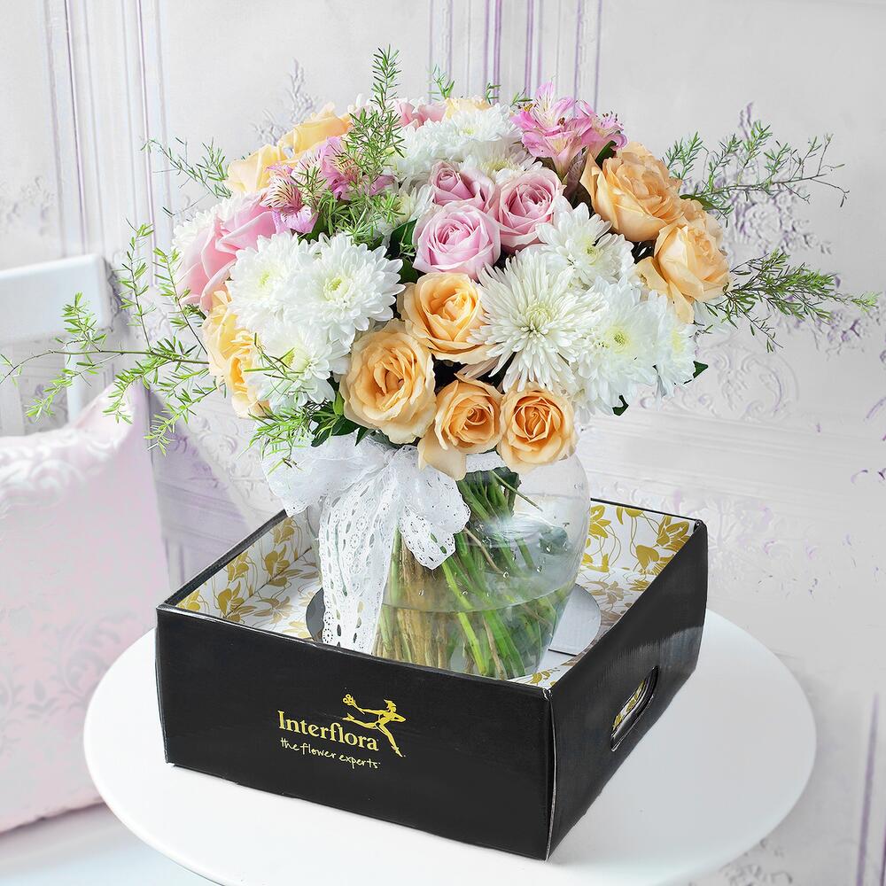 An arrangement as fresh as the first day of spring. Flowers to soothe your soul - roses, chrysanthemums, disbuds, and alstroemerias come together for this heavenly floral delight placed in a curved glass vase
