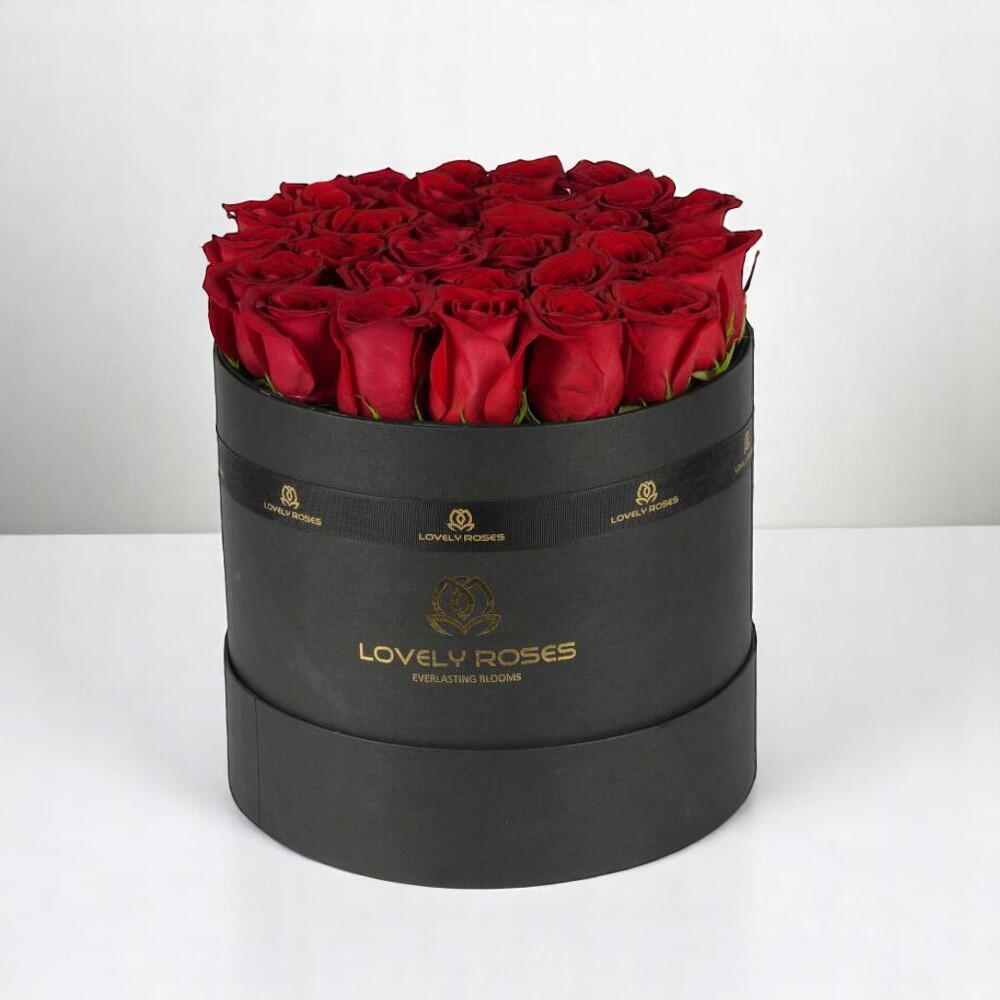 Introducing the Elegant Red Rose Box, a luxurious and timeless gift that speaks volumes. This stunning arrangement features 25 vibrant, freshly bloomed red roses, perfectly arranged in a chic black box with gold accents. The roses symbolize love, beauty, and passion, making this gift the perfect choice for any special occasion—be it an anniversary, Valentines Day, or a heartfelt gesture to express your deepest emotions. With its sleek, elegant design and high-quality roses, this box creates an unforgettable impression. Each rose is carefully selected to ensure a flawless, breathtaking look that will last for weeks, allowing your loved one to enjoy its beauty long after the moment. This box of roses is a true symbol of sophistication and love, offering both elegance and a lasting memory. Fresh roses delicately packaged in a circular box. The roses are ethically-sourced from Ecuador. Available in a wide range of colors.