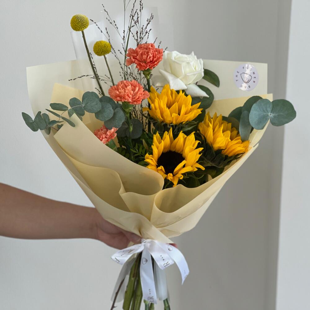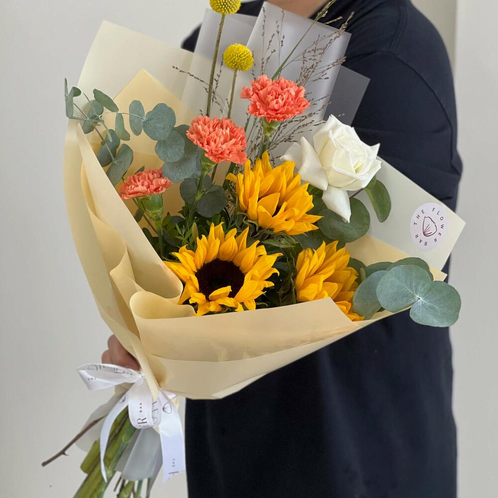 Eucalyptus - 1 pcs Sunflower - 3 pcs Wrapping - 1 pcs rose white - 1 pcs craspedia - 2 pcs panicum - 1 pcs carnation orange - 3 pcs