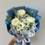 1. Creamy White roses 2. White spray chrysanthemums 3. Baby’s breath with green foliage 4. Hand-tied in blue wrap with satin ribbon 5. Elegant, fresh and ready to gift A cool-toned bouquet that balances softness and structure: velvety ivory roses mingle with cheerful white daisies, cloud-like gypsophila and silvery eucalyptus. Arranged in layered blue wrapping, this stylish hand-tied design suits birthdays, new baby celebrations, thank-yous and get-well wishes. Its neutral palette makes it perfect for friends, colleagues, moms and wives—anyone who loves timeless florals with a modern twist. Delivery Timing Order before 9:00 PM for same-day delivery across Dubai, Abu Dhabi and other emirates. Midnight delivery is available. Choose your preferred date and a one-hour express window at checkout. Our drivers hand-carry arrangements to keep blooms upright and protected in transit. Care Tips Trim stems 1–2 cm at a slant and place in fresh, cool water. Refresh water every 1–2 days and keep away from direct sun and heat. Remove any leaves below the waterline to prevent bacteria.