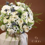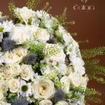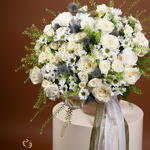 eryngium - 5 pcs thlaspi - 4 pcs spray rose white - 10 pcs santini white - 9 pcs whie rose - 12 pcs carnation wihte - 7 pcs vase medium - 1 pcs