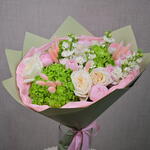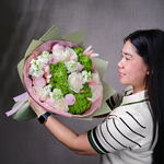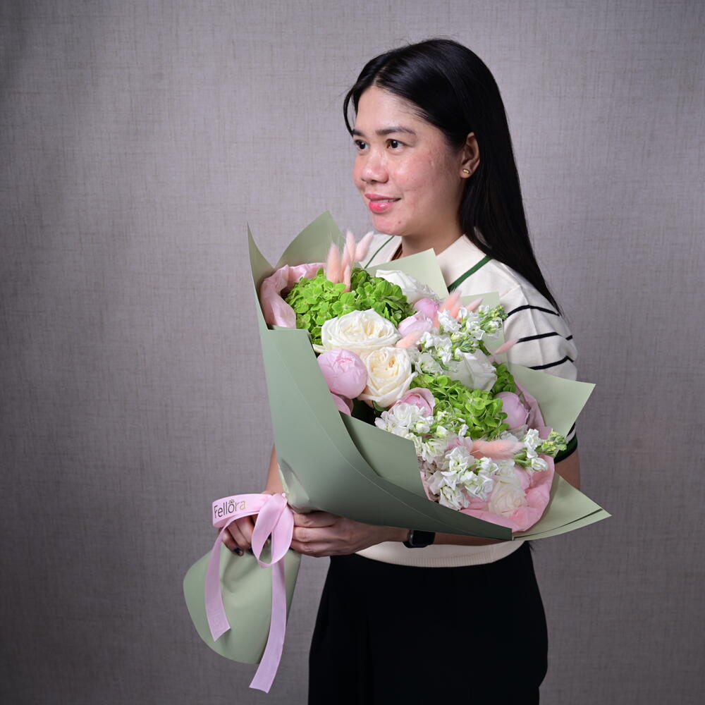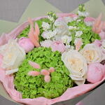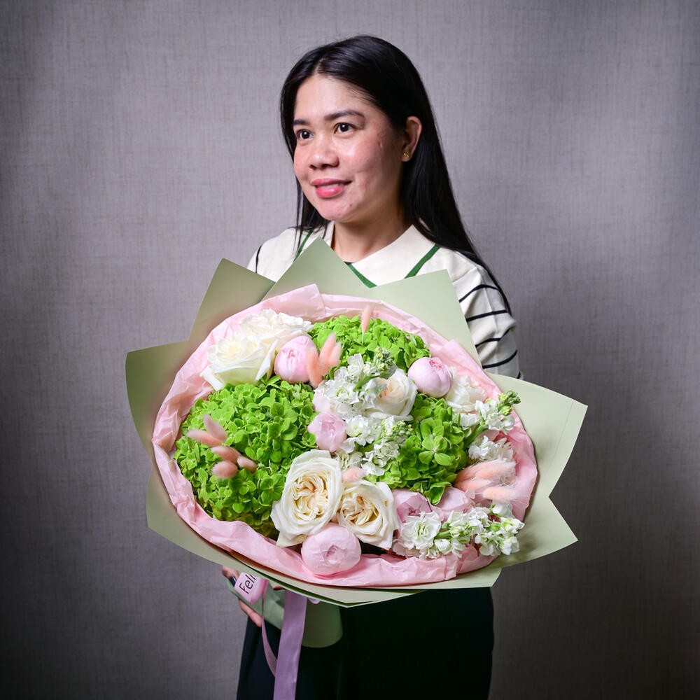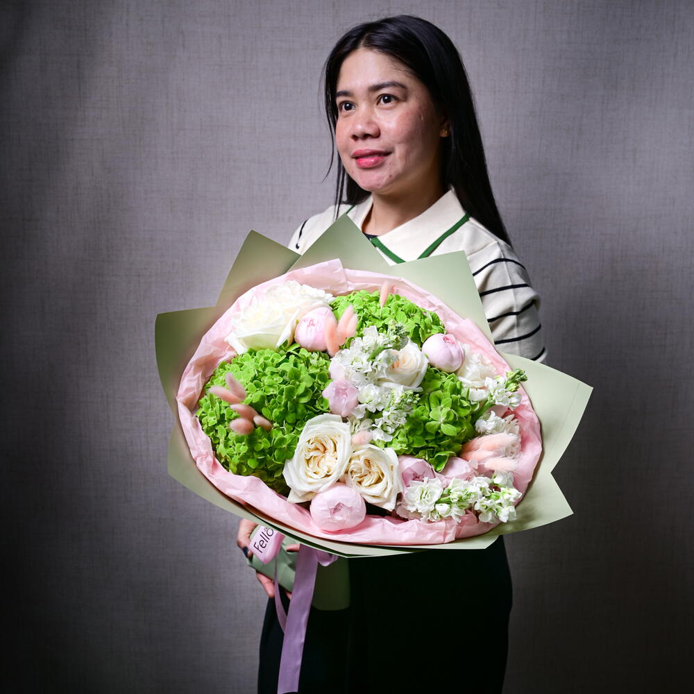 Ribbon - 1 pcs Hydrangea - 3 pcs matthiola - 5 pcs wrapping paper - 4 pcs ohara rose - 5 pcs bunny tail - 10 pcs peony roses - 9 pcs