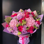 Statice - 5 pcs Eustoma - 10 pcs Spray rose - 3 pcs Hydrangea - 3 pcs Lisianthus - 10 pcs lipidium - 5 pcs fuchsia roses - 7 pcs