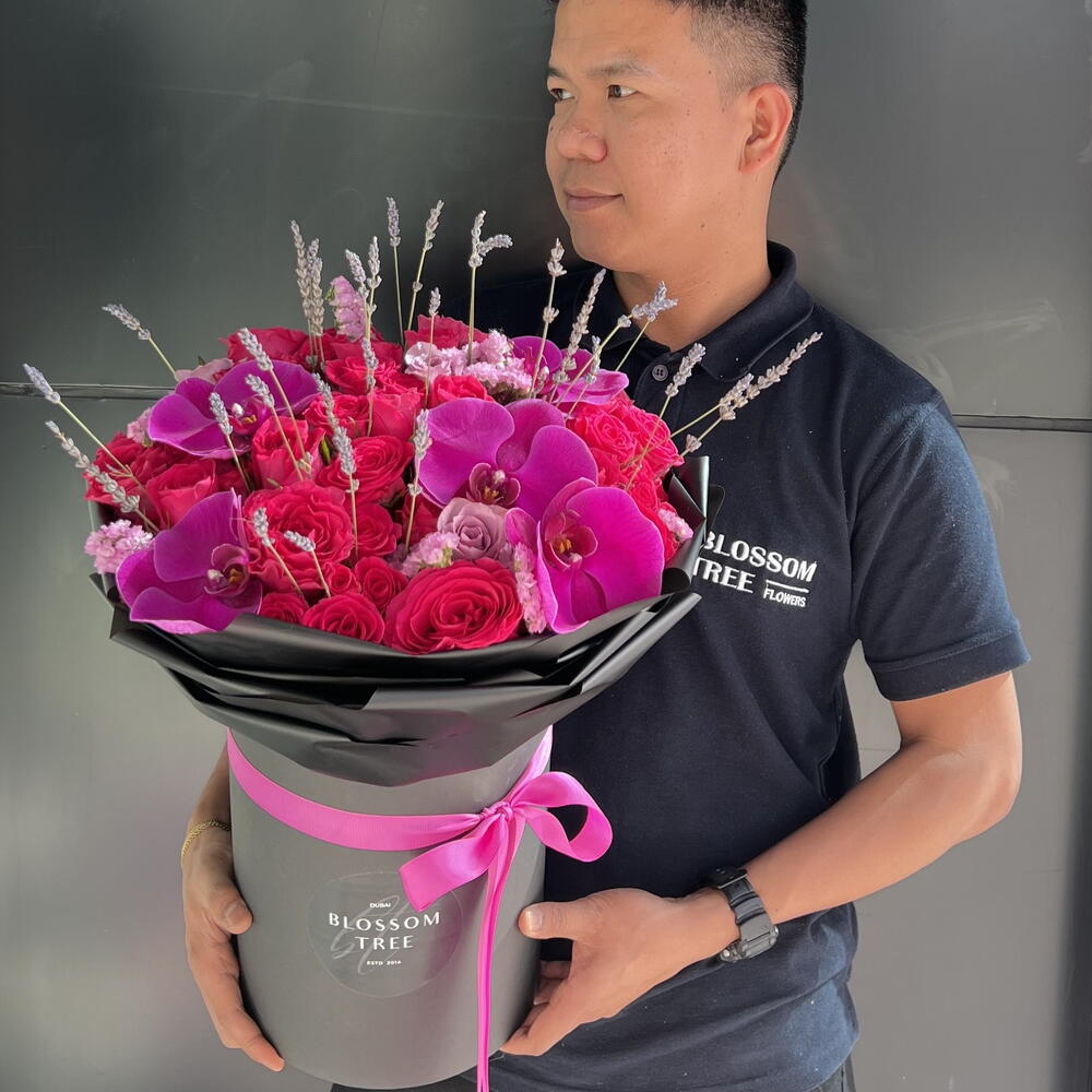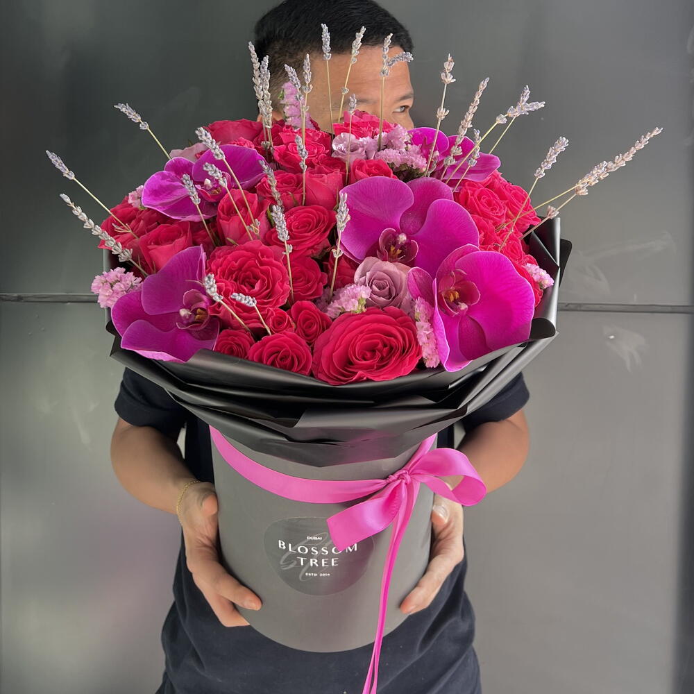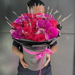 Immerse yourself in the stunning beauty of this handcrafted florists special bouquet. Composed of five lavish orchids, five hotpink roses, five adorable hotpink baby roses, three deep purple roses, and three stems of statice, this arrangement promises a visual spectacle like no other. The perfect blend of vibrant colors and delicate scents create an atmosphere of pure bliss and tranquility. Whether its for a special occasion or simply to bring a touch of elegance into your space, this bouquet is a statement of grace and passion.