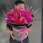 Statice - 3 pcs deep purple rose - 3 pcs orchid cut - 5 pcs hotpink rose - 5 pcs hotpink baby rose - 5 pcs