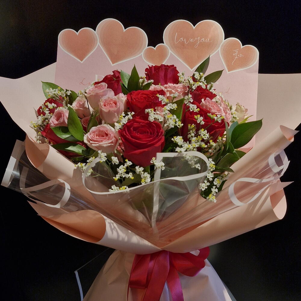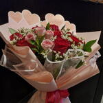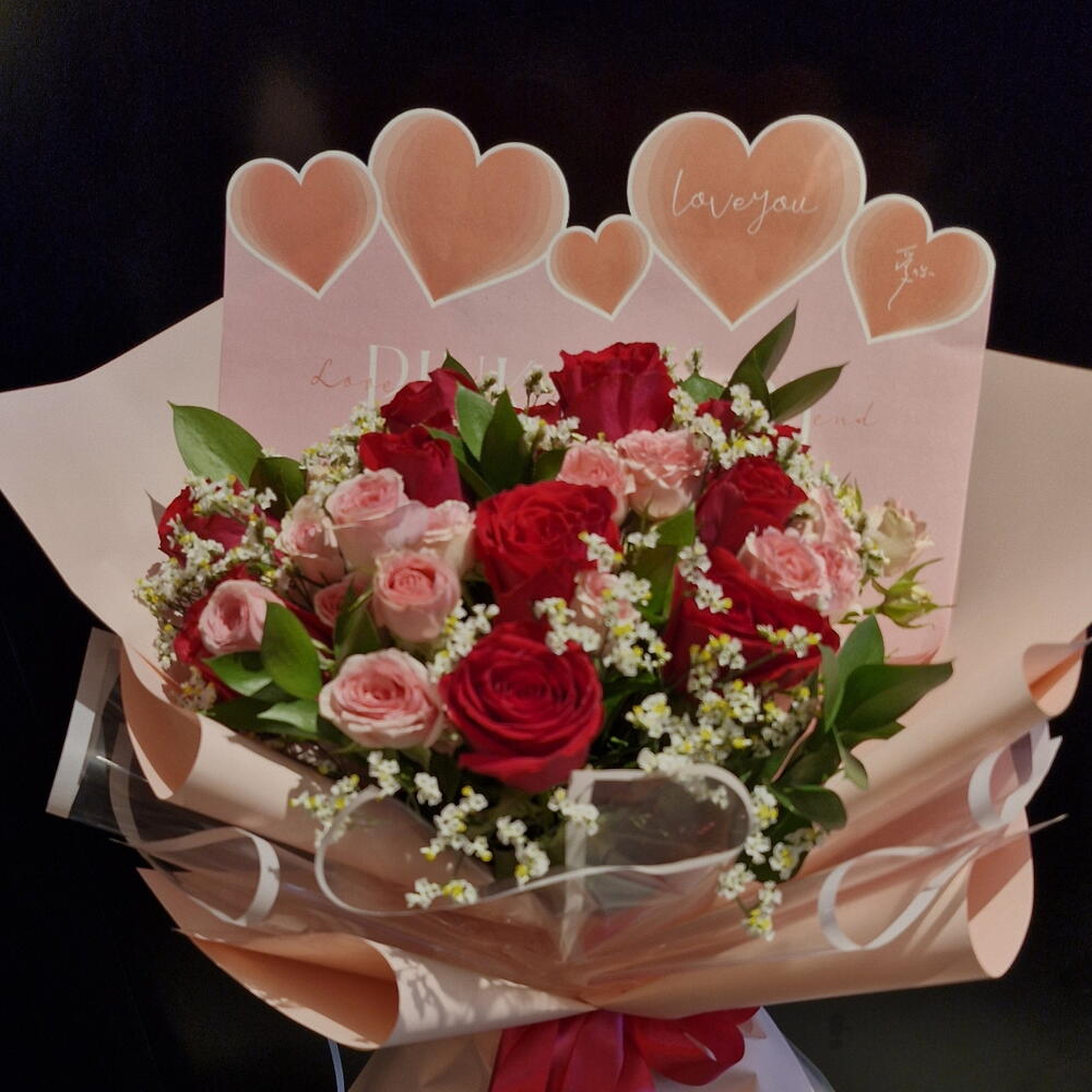baby rose pink - 4 pcs limonium white - 10 pcs rascuss leaves - 6 pcs rose fushia pink - 10 pcs