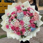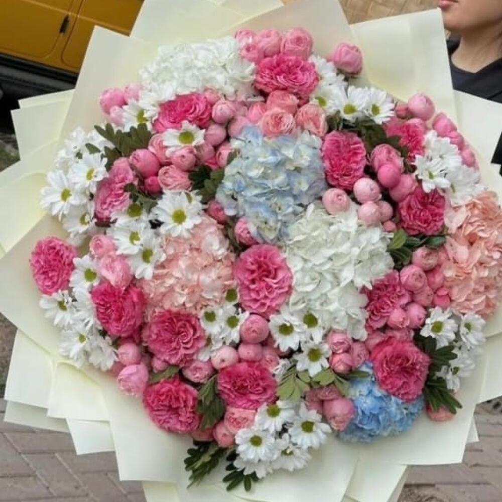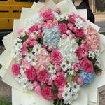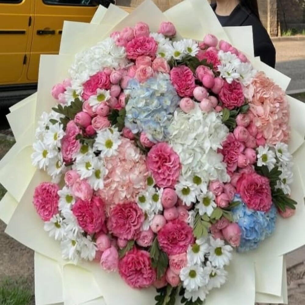 white chrysanthemum - 10 pcs pink expresion - 15 pcs blue hydrangea - 2 pcs wrapping paper - 6 pcs white hydrangea - 2 pcs pink hydrangea - 2 pcs mansfield park pink peony rose - 18 pcs