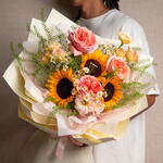 Sunflower - 3 pcs daisy - 3 pcs ribbon satin - 1 pcs lipidium - 4 pcs pink expresion garden rose - 3 pcs decoration wrapping - 5 pcs