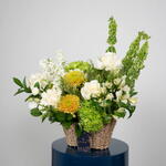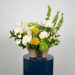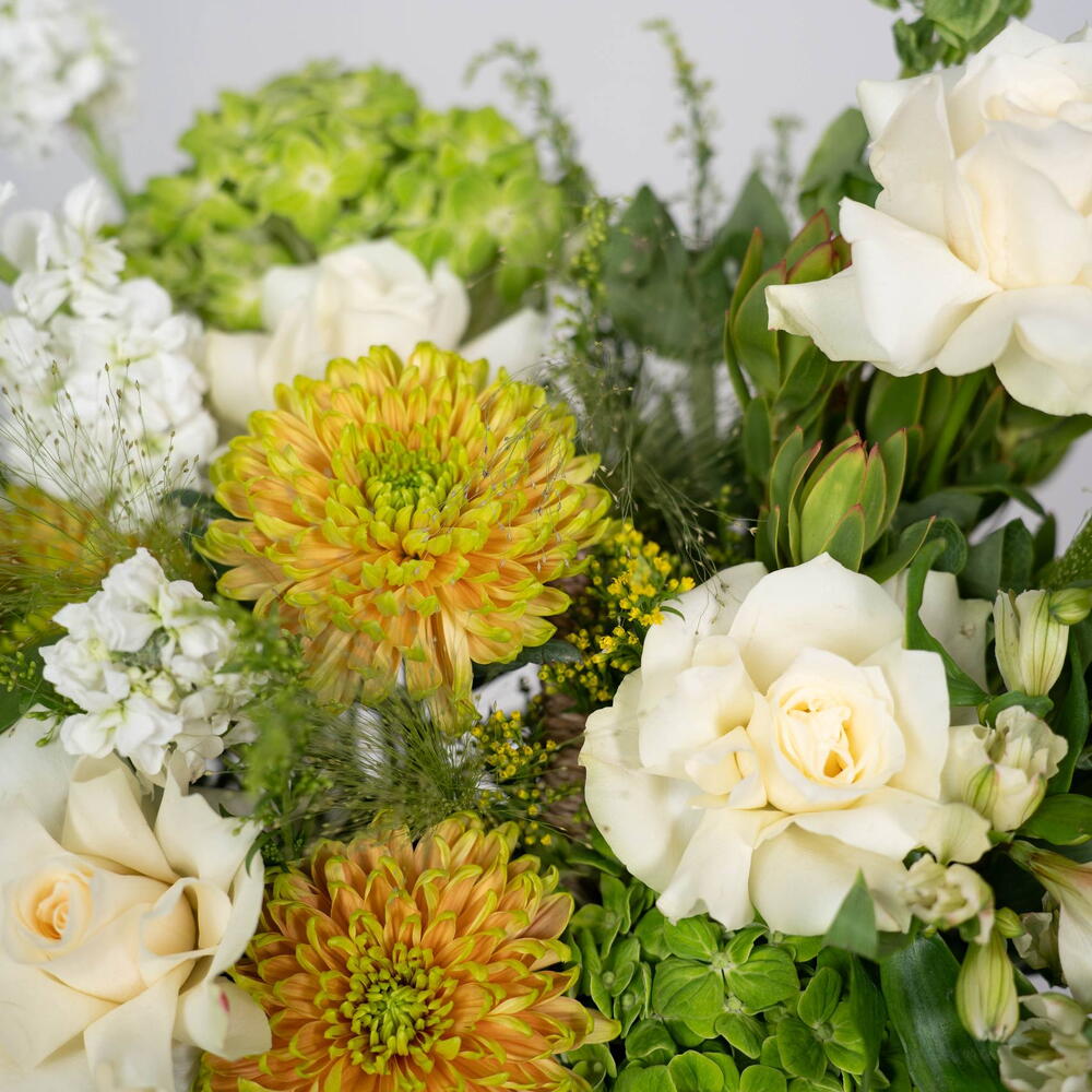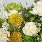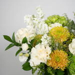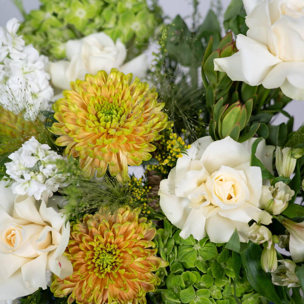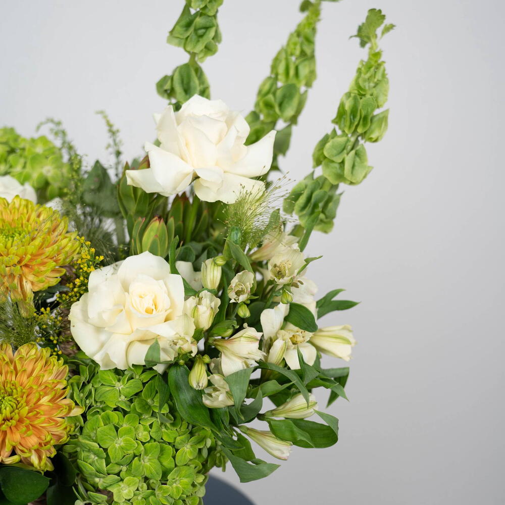 Solidago - 3 pcs Eustoma white - 1 pcs rose white - 5 pcs alstroemeria white - 5 pcs hydrangea green - 2 pcs single ruscus - 4 pcs matthiola white - 5 pcs safari sunset - 1 pcs panicum fountain - 5 pcs moluccella leaves - 3 pcs chrysanthemum showdown zembla - 3 pcs