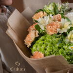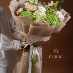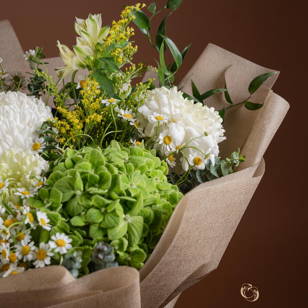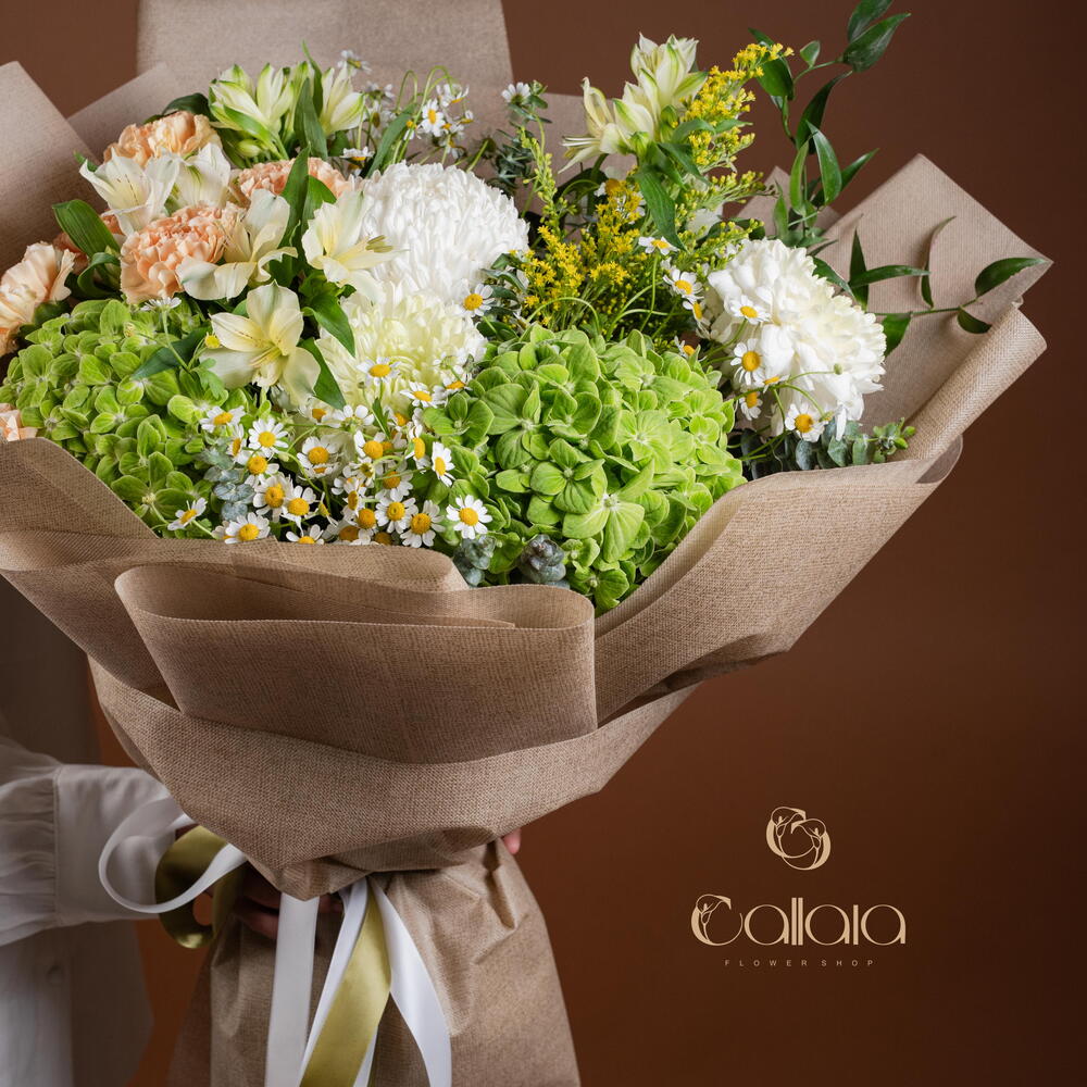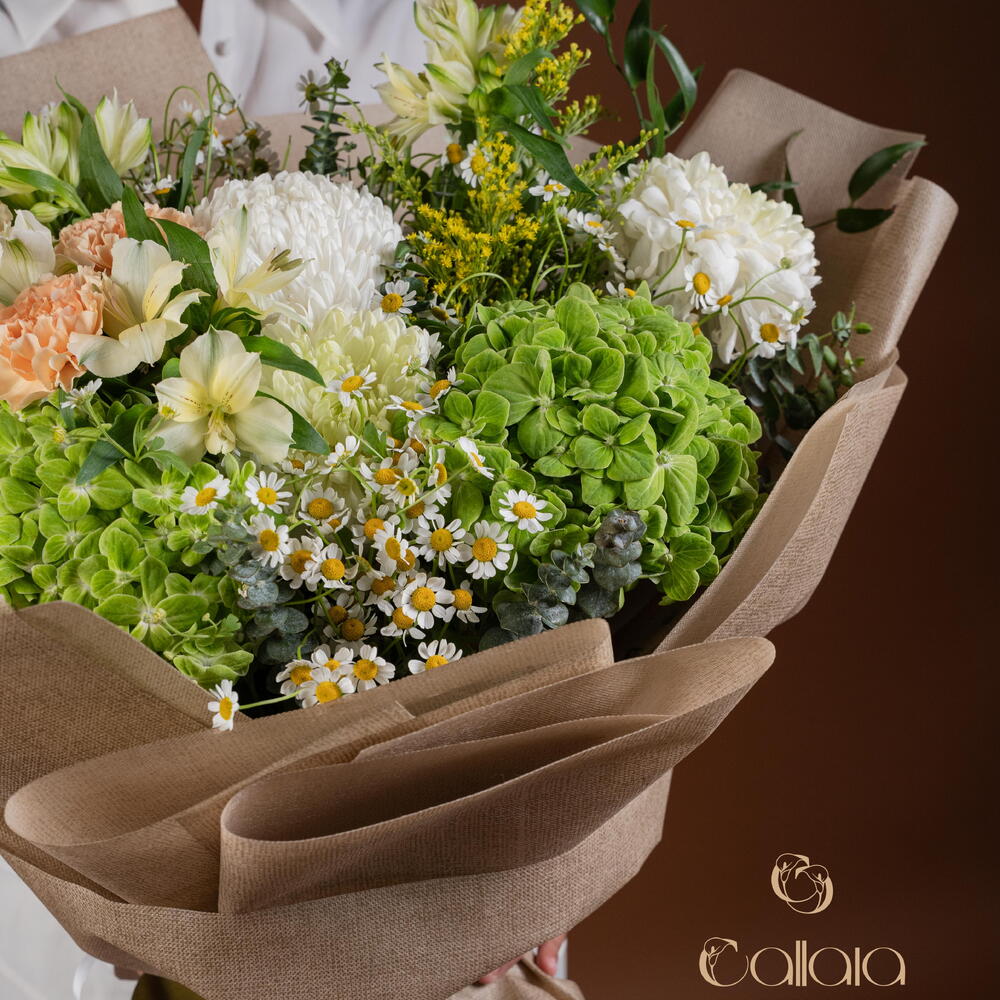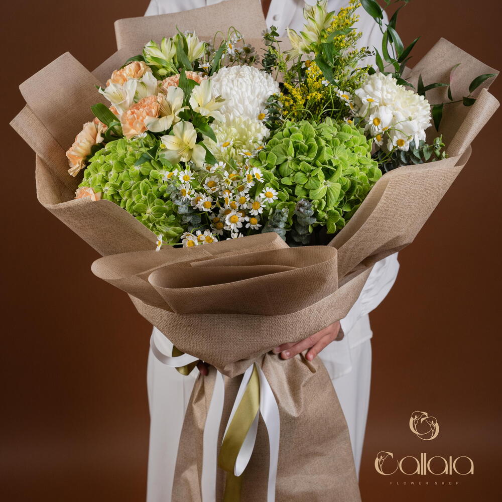 Indulge yourself or a loved one with our florists special selection, tastefully arrayed with an exquisite mix of 6 peach carnations, surrounded by a complementary combination of 4 tanacetums and 2 green hydrangeas. The arrangement is further enhanced with the striking beauty of 2 solidagos and 4 alstromeria, artfully arranged with 3 distinctive white deco and 3 aromatic eucalyptus. Completing the picture of perfection is a single, elegant Italian ruscus. This ensemble is sure to capture the eye and enchant the senses, making it a gift of unparallel elegance.