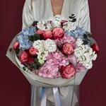 Eucalyptus - 1 pcs syringa white - 3 pcs hydrangea light pink - 1 pcs hydrangea light blue - 1 pcs rose garden cream red - 5 pcs
