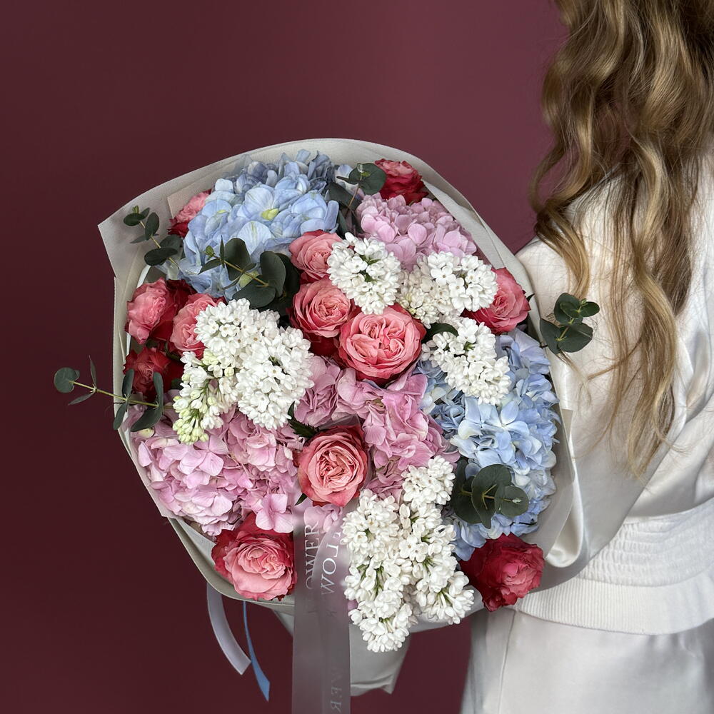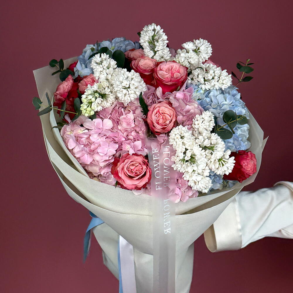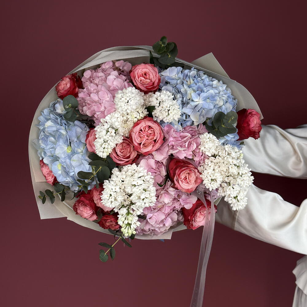 A charming and gentle mix of hydrangea, lilac, and roses, arranged into a delightful small bouquet. This natural composition evokes feelings of tenderness, joy, and admiration. Its a sweet, thoughtful gift perfect for Birthdays, Mothers Day, thank you gestures, or simply to brighten a loved ones day.