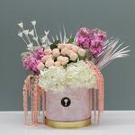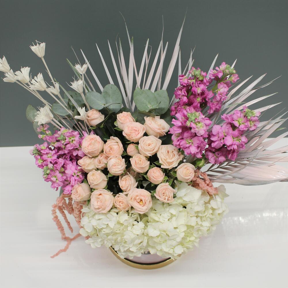 Our exquisite box arrangement includes two beautiful white hydrangeas, delicate Matthiola Iron Pink, elegant spray roses with leaves, and charming dry flowers