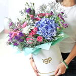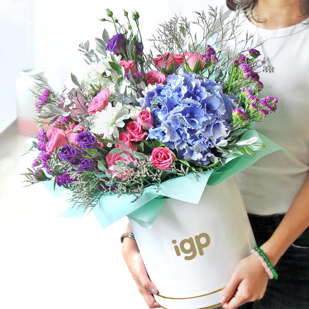 A surreal sight is a group of the most exotic blooms put together in the harmonious arrangement, and we thus have this lovely Garden of Delight bouquet. This one includes blue Hydrangea, Lilac Roses, purple Lisianthuses, white Spray Chrysanthemums, purple Statices and mauve Limoniums