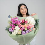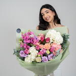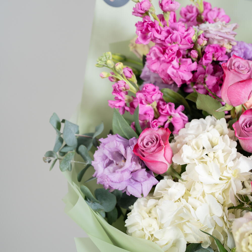 Unveil the magic of floral beauty with our stunning Florists Special arrangement. This artistic creation features a lively mix of 2 lush eucalyptus branches, 8 captivating deep purple roses, and 2 pristine white hydrangeas. This symphony of colors is further accentuated with the soft hues of 3 light purple eustoma blossoms and 3 peach spray roses named Julietta. Complementing this feast of colors, youll find 5 dark pink matthiola stems, adding an intriguing depth and texture to the arrangement. Every single piece in this arrangement exudes natures charm, making it an extraordinary gesture of love and attention.