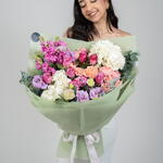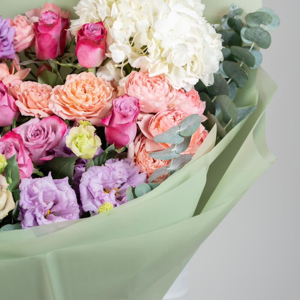 Eucalyptus - 2 pcs rose Deep purple - 8 pcs hydrangea white - 2 pcs eustoma light purple - 3 pcs spray rose julietta peach - 3 pcs matthiola dark pink - 5 pcs