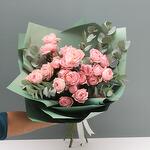 Peach colour Garden Spray Roses wrapped in a green wrapping paper.