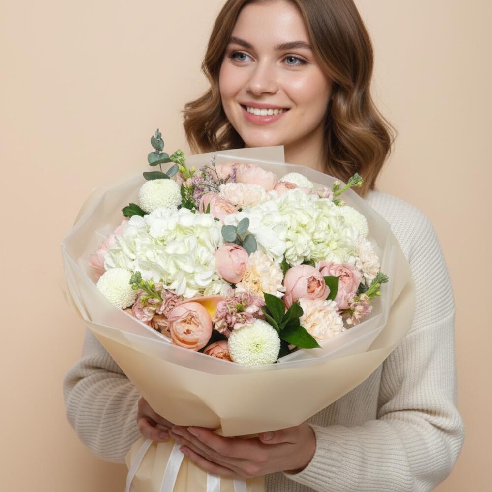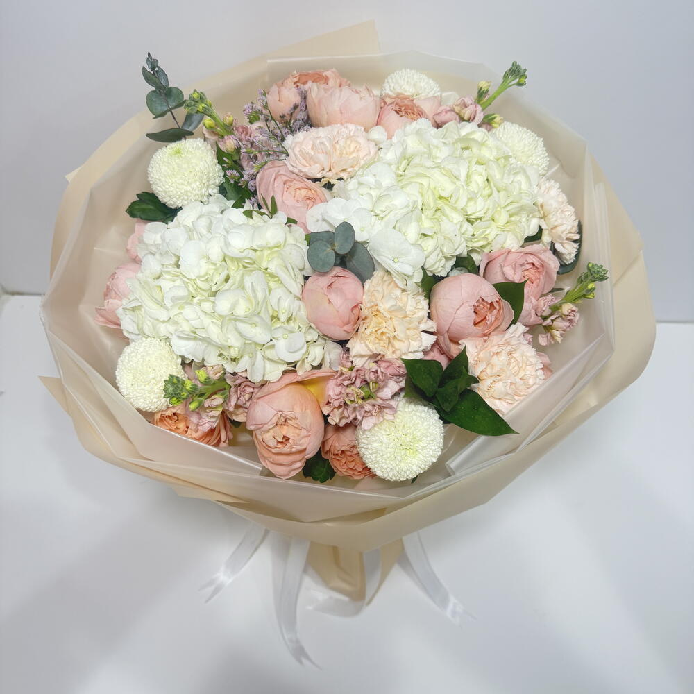 Hydrangea - 2 pcs carnation - 4 pcs ping pong - 4 pcs mathiola - 4 pcs garden spray rose - 5 pcs