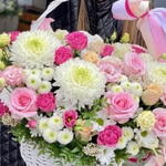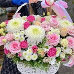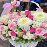 Basket - 1 pcs Pink rose - 15 pcs peach rose - 7 pcs garden rose - 10 pcs pink lisianthus - 10 pcs white daco - 5 pcs russcuss leaves - 10 pcs mini chrysanthemum - 10 pcs barry - 5 pcs