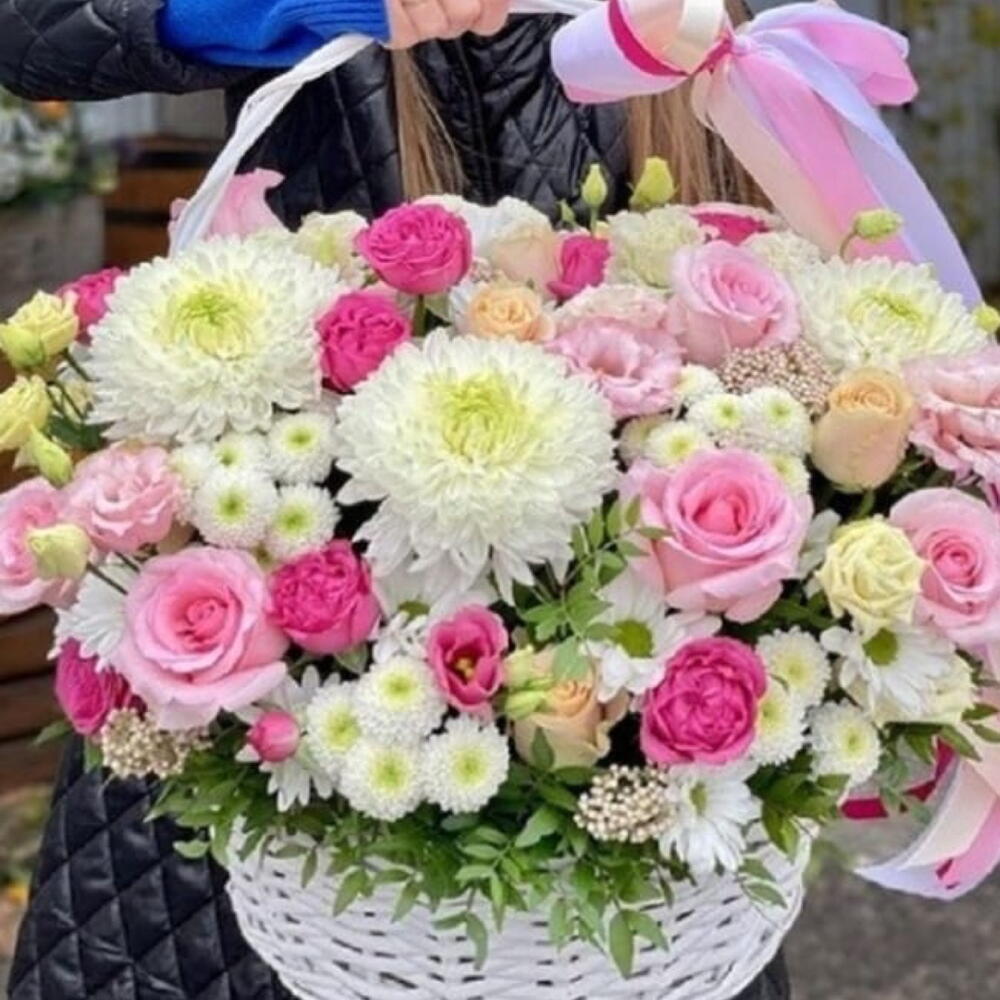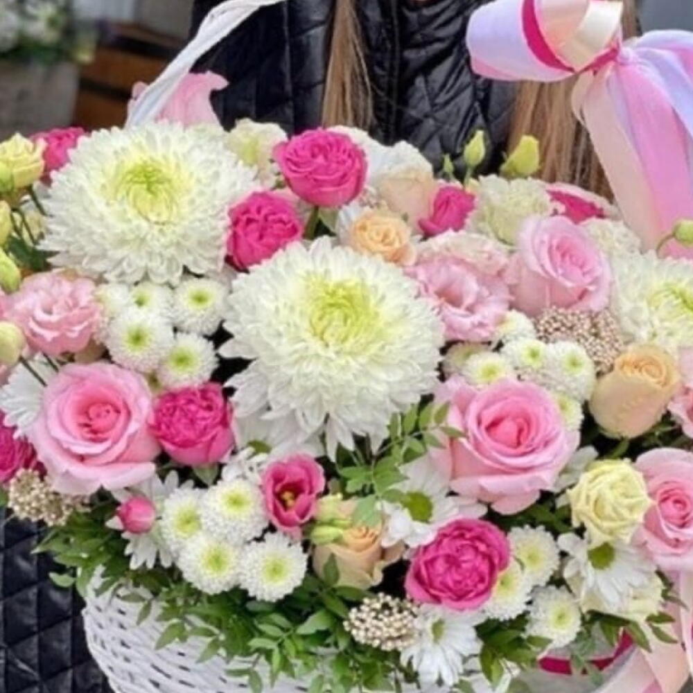 Basket - 1 pcs Pink rose - 15 pcs peach rose - 7 pcs garden rose - 10 pcs pink lisianthus - 10 pcs white daco - 5 pcs russcuss leaves - 10 pcs mini chrysanthemum - 10 pcs barry - 5 pcs