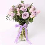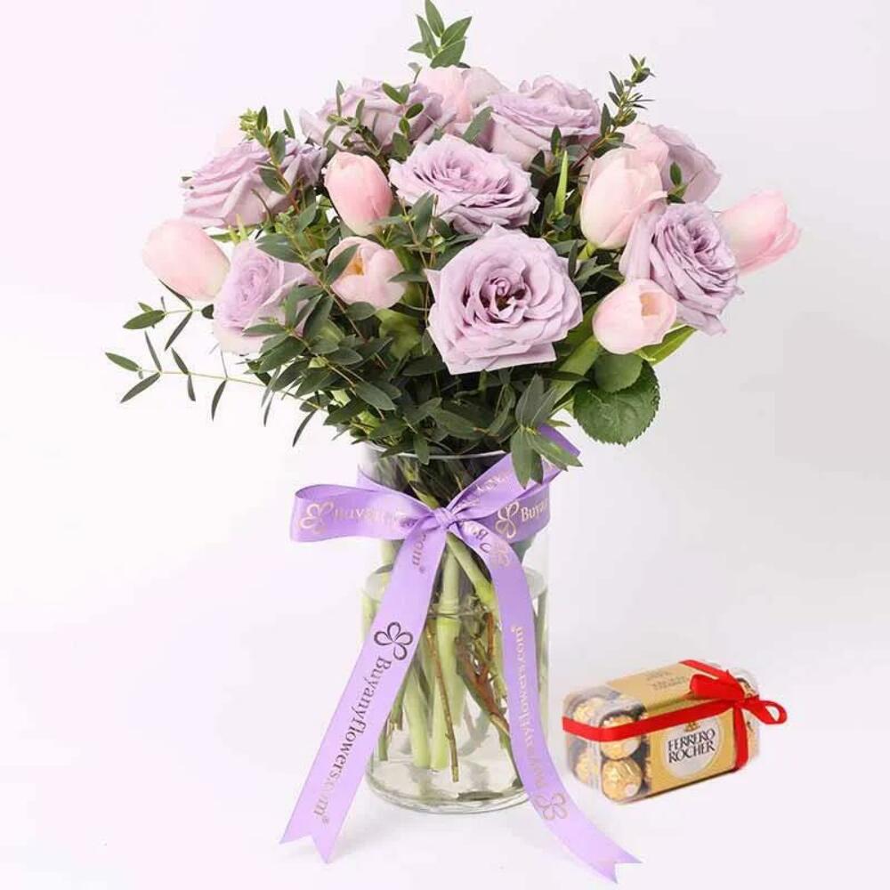 200gm Ferrero Rocher Chocolates 11 Purple Roses 10 Pink Tulips Palviforia Leaves Prepared in Glass Vase and a Ribbon Bow