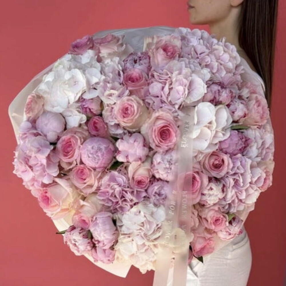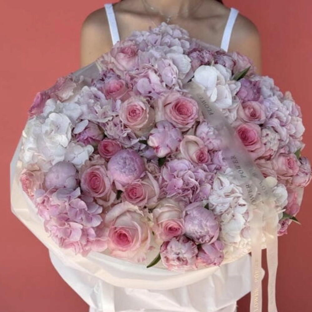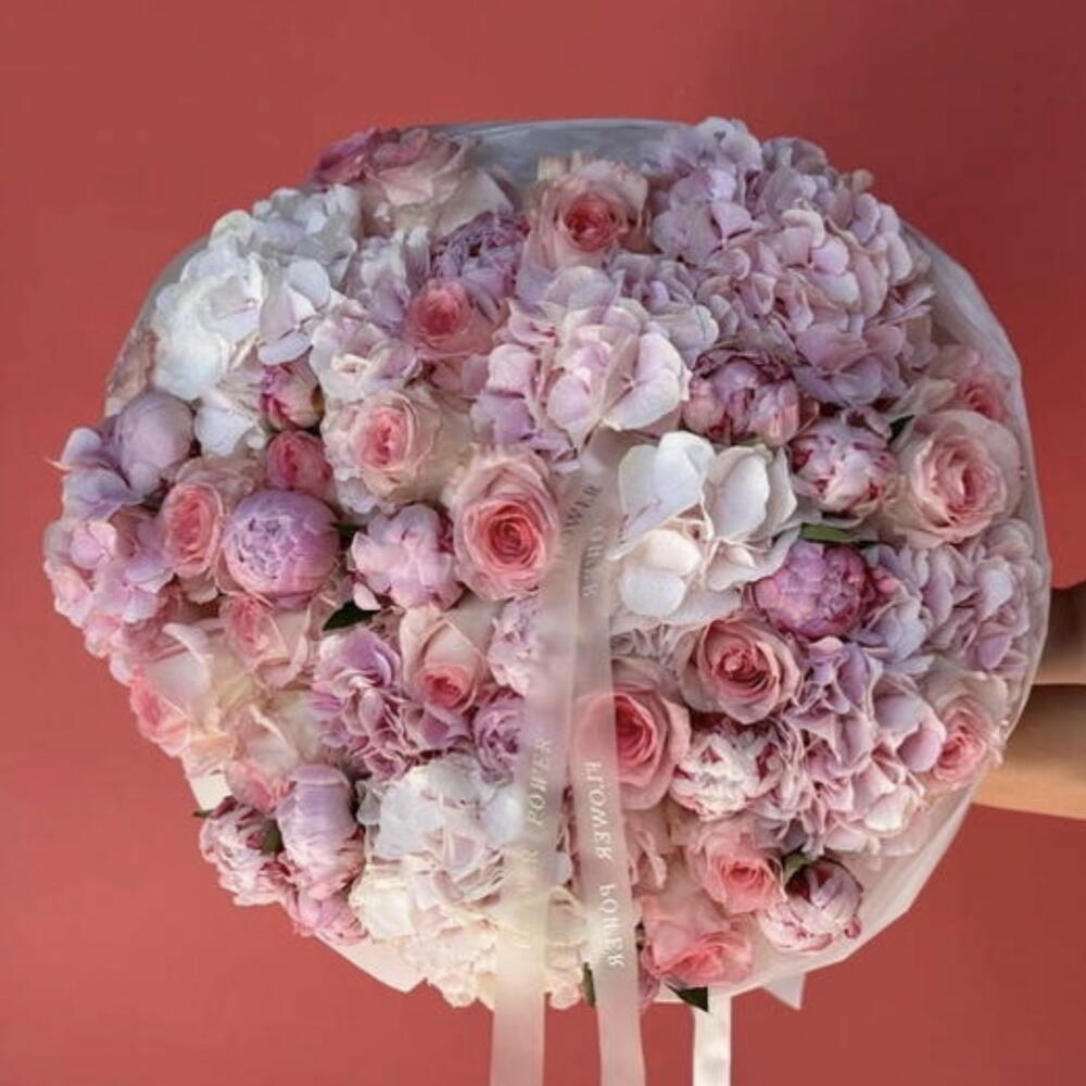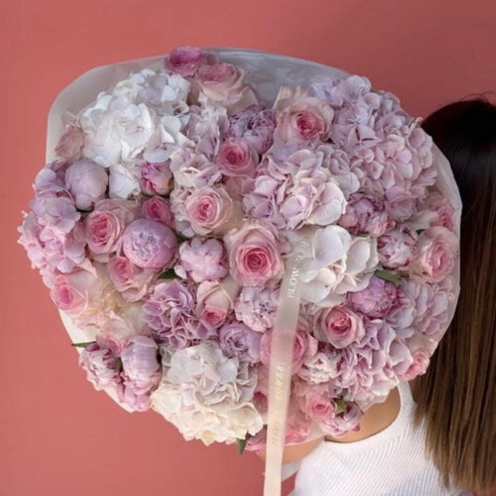 A romantic and refined bouquet blending the softest shades of blush pink, creamy white, and gentle peach undertones. Lush peonies form the heart of the composition, beautifully supported by delicate roses and airy hydrangeas that create volume, texture, and elegance.