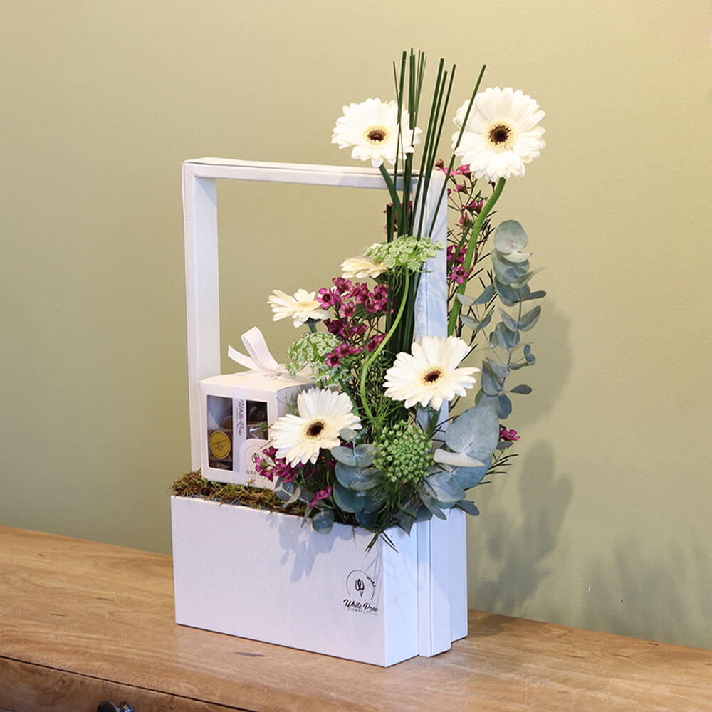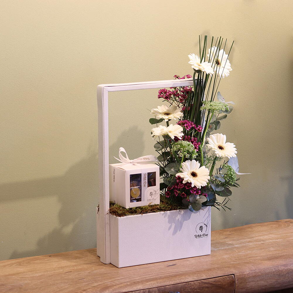 combination of Gerbera and other mix of flowers arranged with 350g Chocolate in a Leather Bag