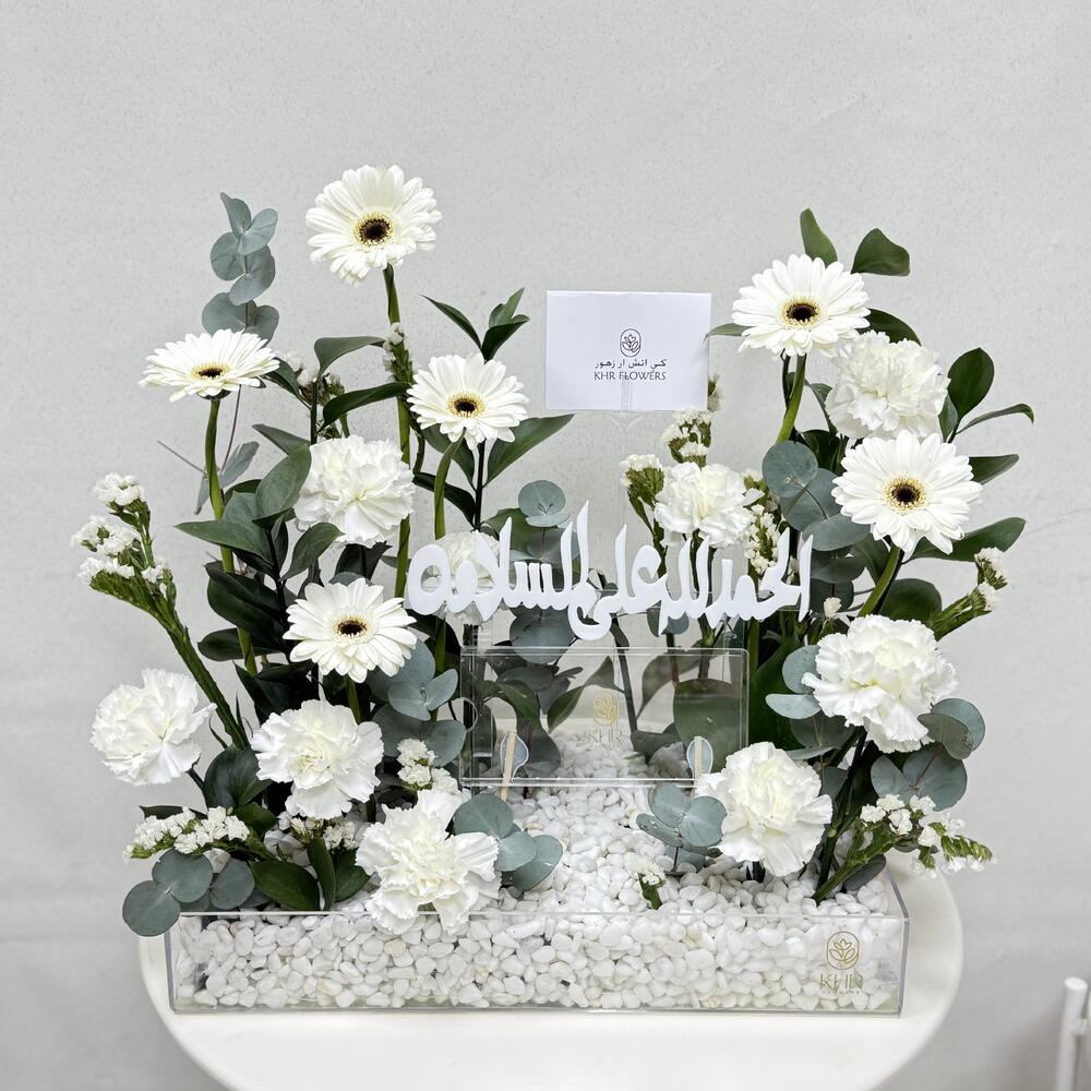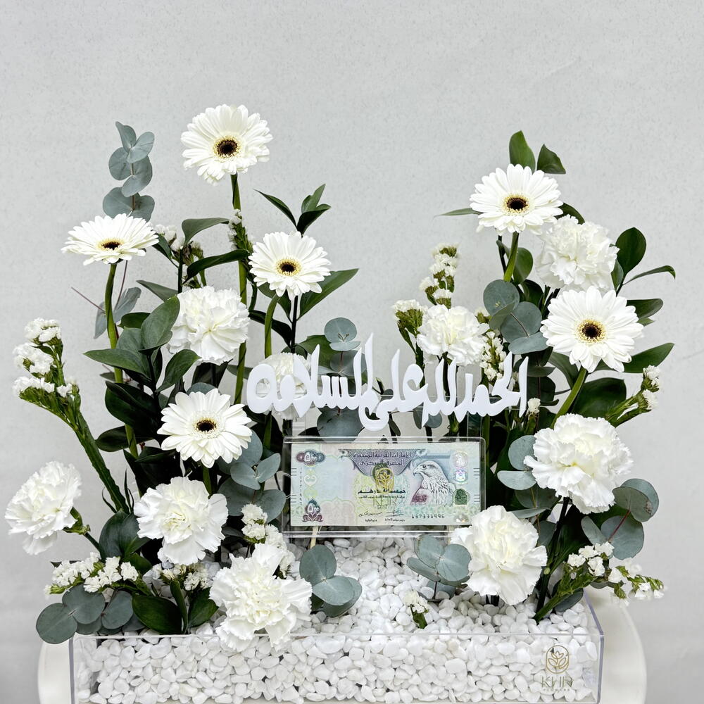 carnation white - 8 pcs statice white - 4 pcs eucalyptus leaves - 6 pcs gerbera white - 6 pcs acrylic money box - 1 pcs acrylic banner - 1 pcs