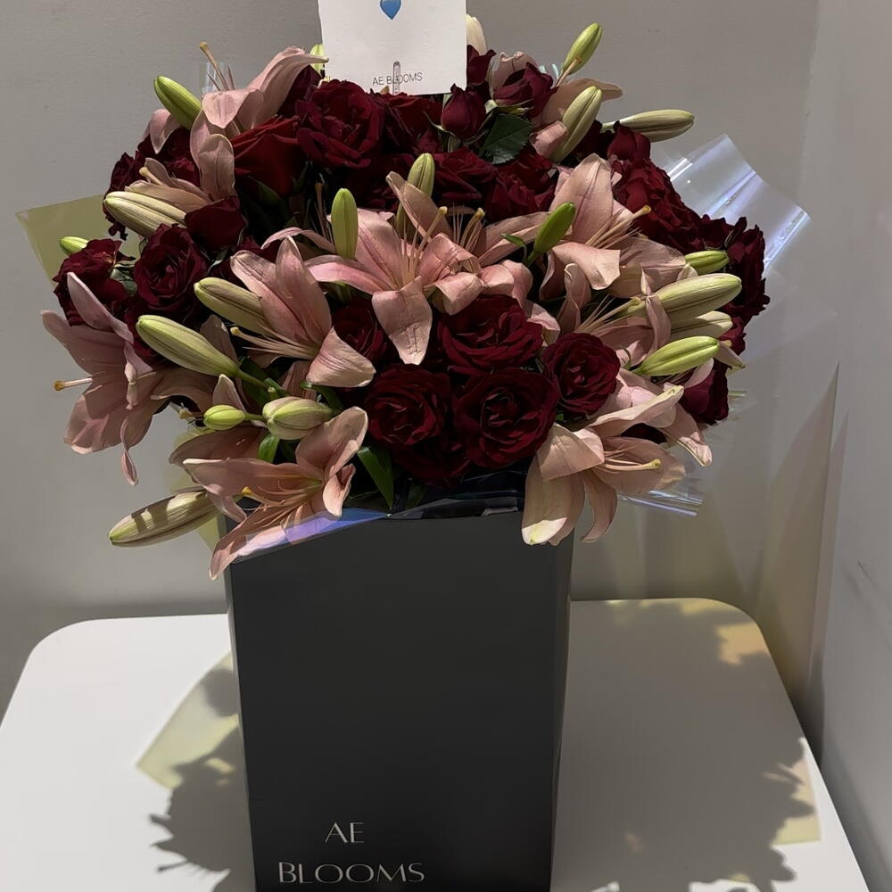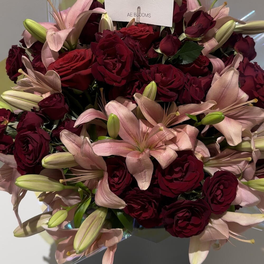 Submerge yourself into an enchanting sea of colors with this stunning Mono Bouquet. It features six luxurious pink lilies, synonymous with adoration and grace, blissfully matched with six vibrant red baby roses, traditionally revered for their perpetual beauty and love. This elegant array of flowers breathes life into any setting, making it a beautiful gift, or a perfect addition to your own living space.