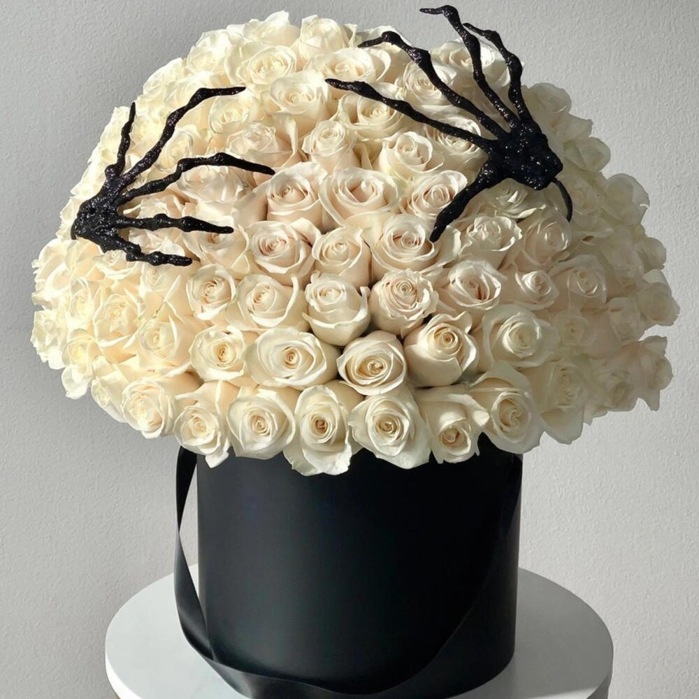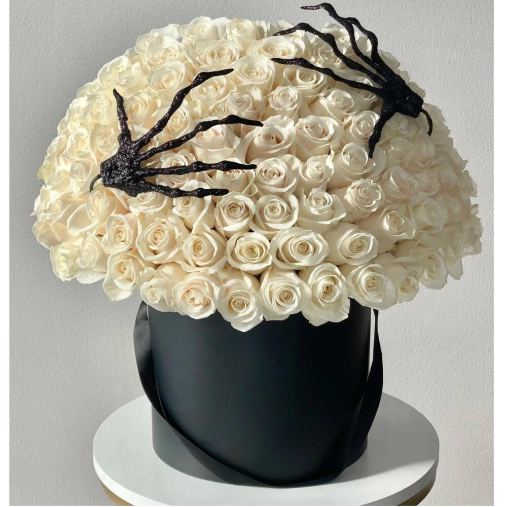 Hauntingly beautiful, eternally graceful. Ghosted Grace is an ethereal masterpiece that merges elegance with eerie allure. Eighty-one pure white roses — symbols of eternal love and innocence — bloom from a black luxury hat box, crowned with decorative black skeleton hands gently resting atop, as if beauty itself has been claimed by the shadows. This monochrome creation embodies spooky sophistication, a perfect statement for Halloween décor, luxury gifting, or romantic souls who adore the dark side of beauty. Includes: 101 premium white roses 🤍 Black luxury hat box 🎩 Black decorative skeleton hands 🖤🦴 Optional black spider web or dark ribbon accents Perfect for: Halloween gifts • Gothic décor • Dark romance lovers • Luxury events and photoshoots