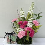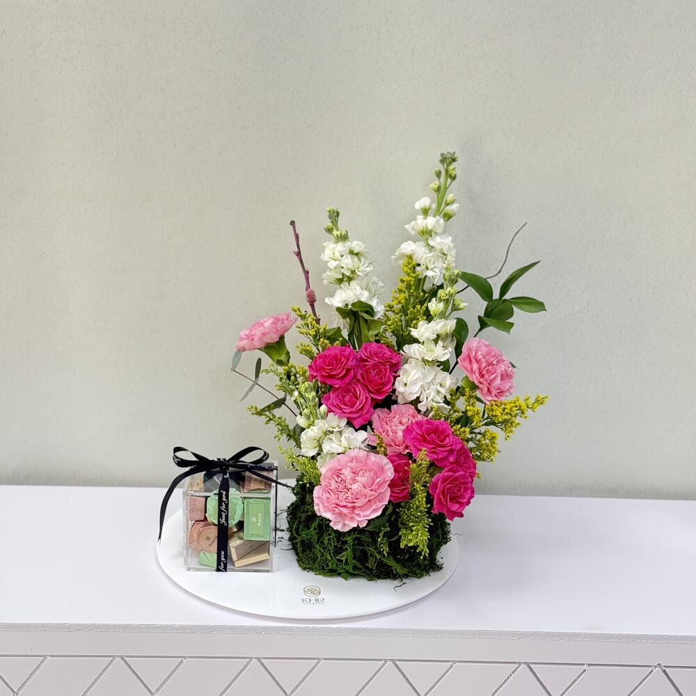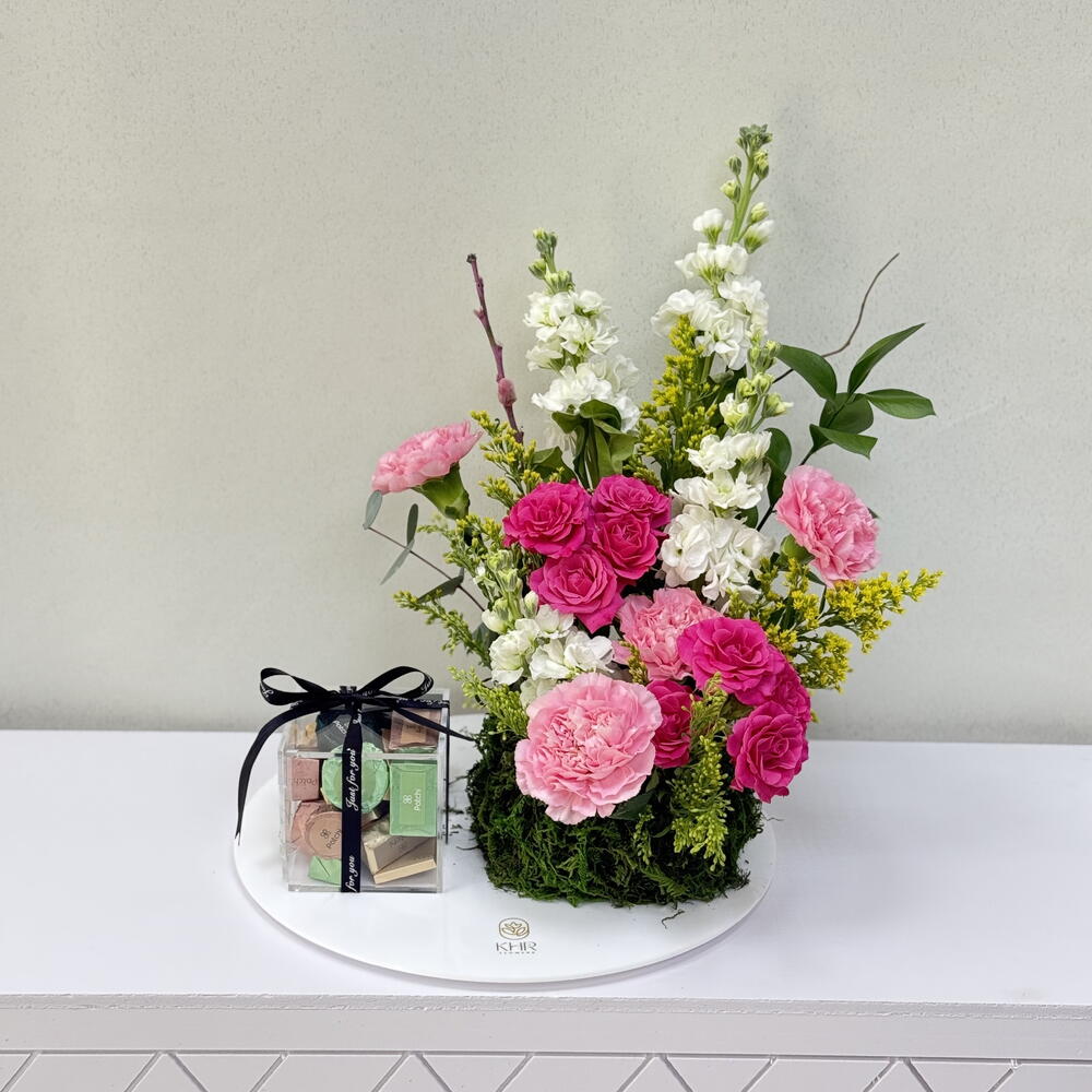 Solidago - 3 pcs carnation pink - 4 pcs eucalyptus leaves - 2 pcs baby rose pink - 2 pcs patchi 250 gram box - 1 pcs mattiullah white - 4 pcs
