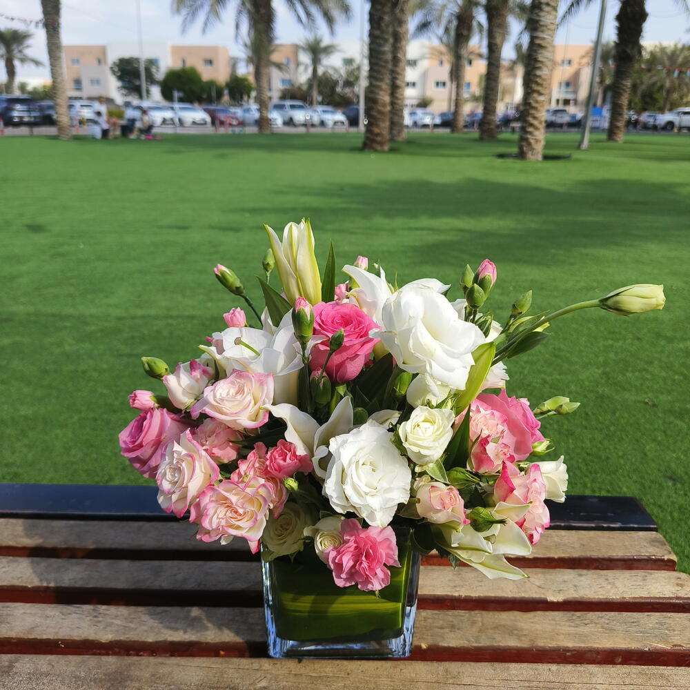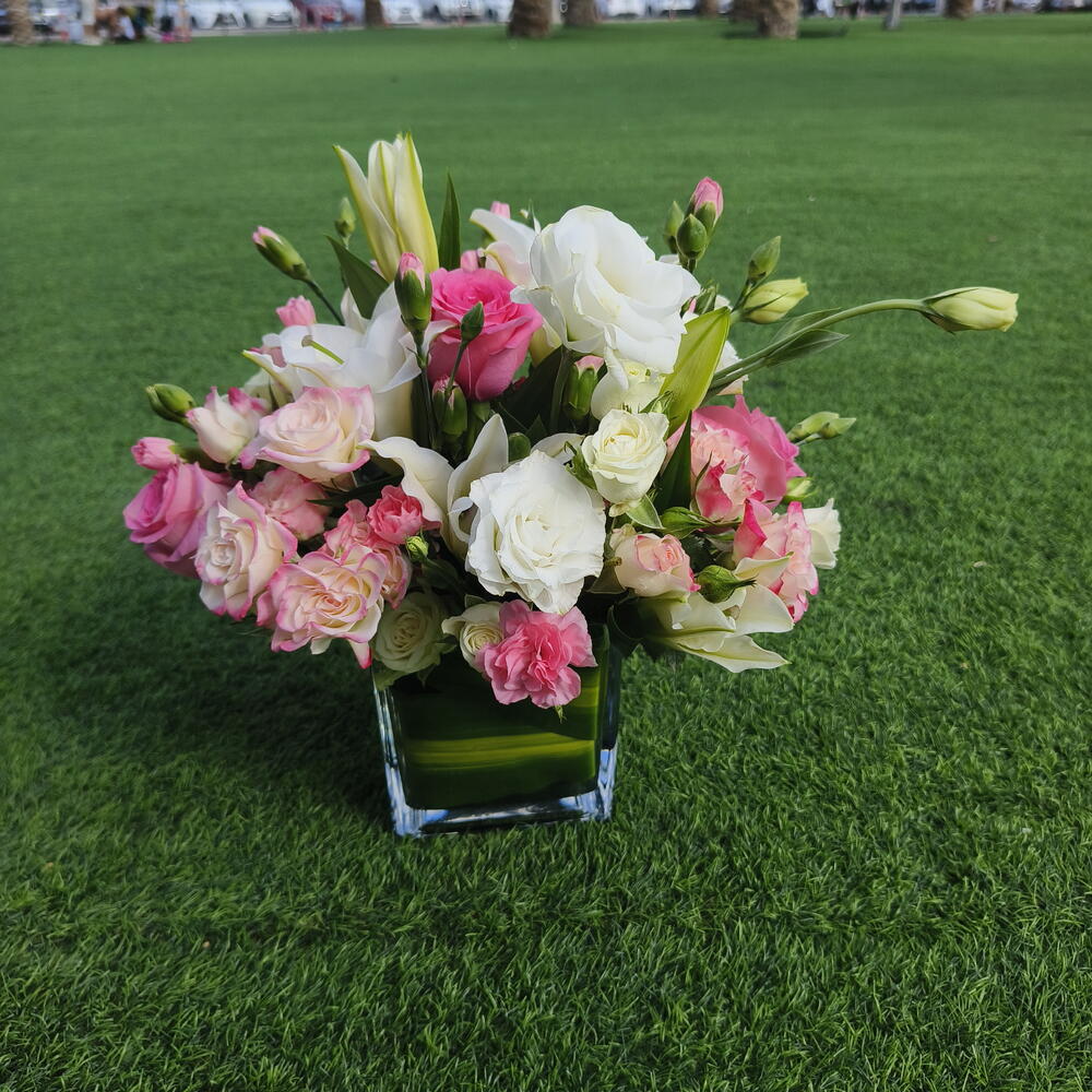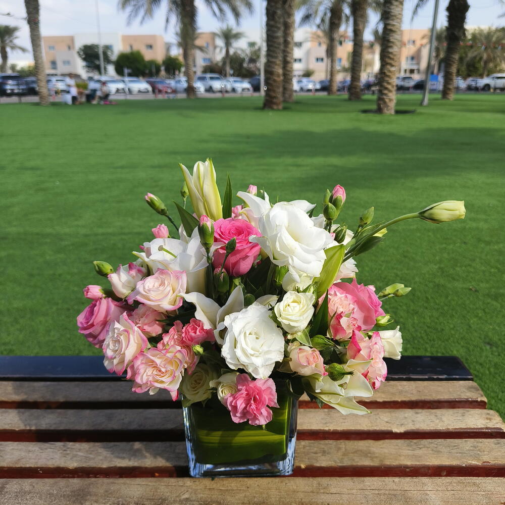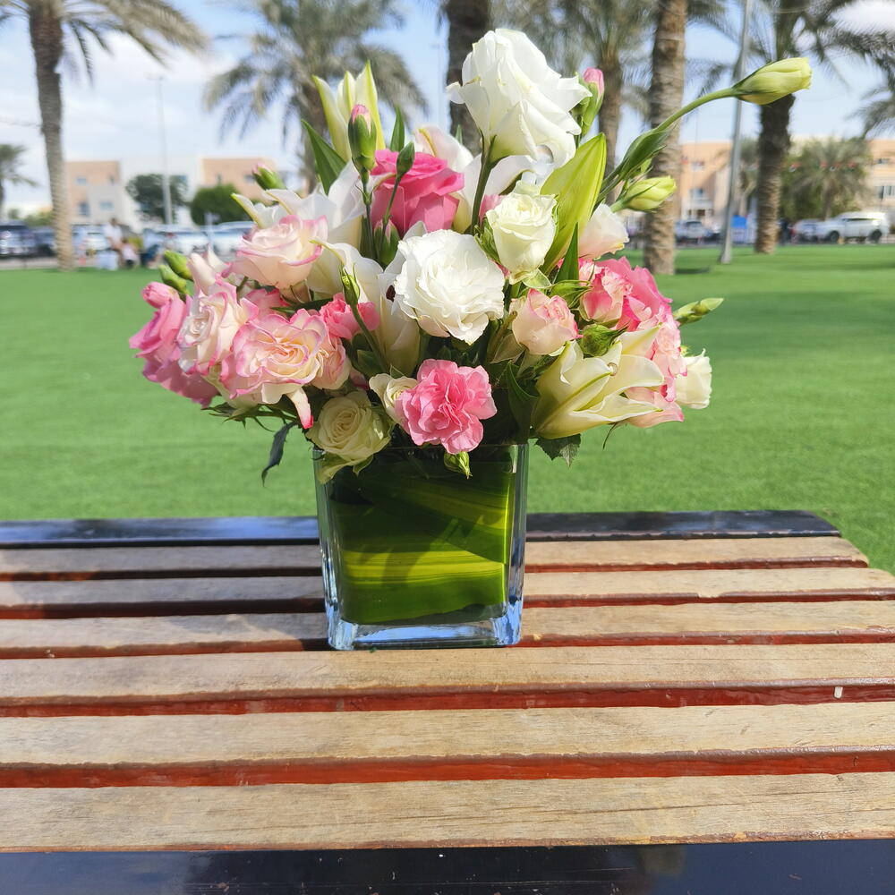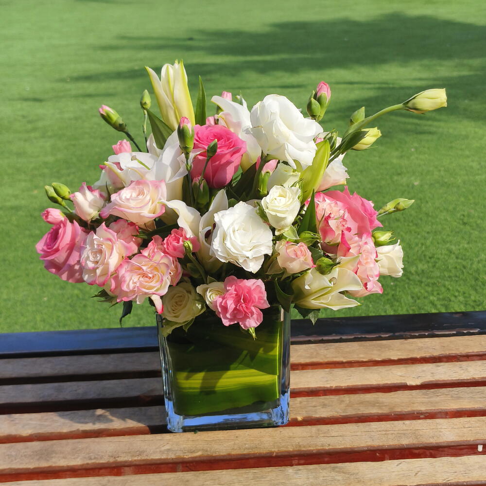 Spray rose - 5 pcs Chrysanthemum - 5 pcs carnation pink - 5 pcs vase arrangements - 1 pcs lilly flowers - 2 pcs lisanthus white - 2 pcs