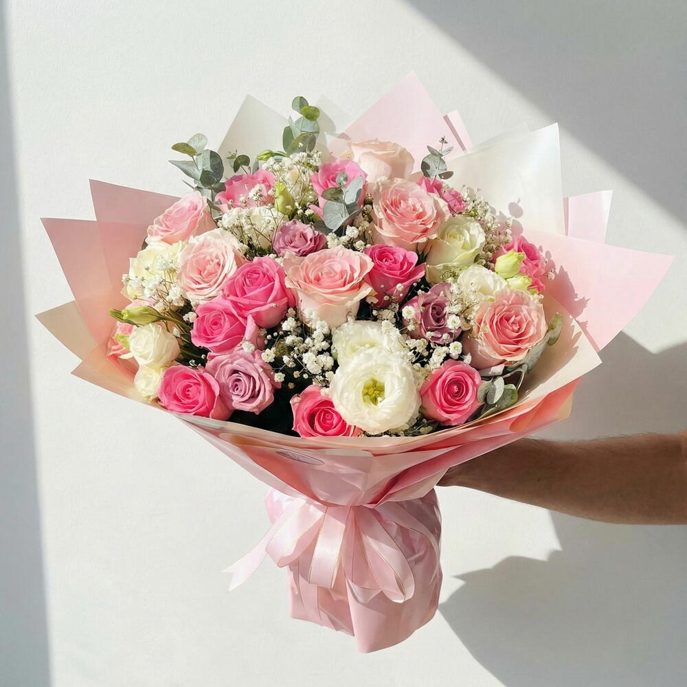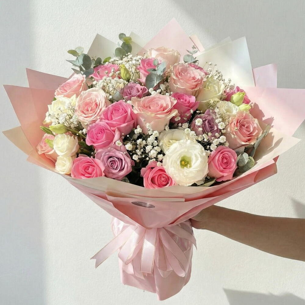 Eucalyptus - 1 pcs rose Deep purple - 3 pcs rose white - 5 pcs lisianthus white - 2 pcs gypso - 2 pcs rose revival - 7 pcs rose candy girl - 7 pcs
