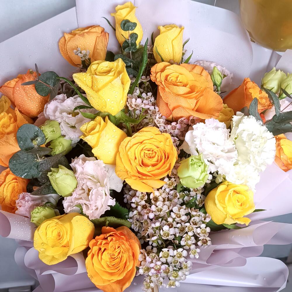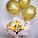 rose orange - 10 pcs rose yellow - 10 pcs wax pink - 4 pcs lisianthus peach - 3 pcs cinerea - 5 pcs balloon gold - 3 pcs