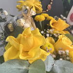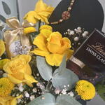 Yellow rose - 5 pcs eucalyptus leaves - 2 pcs yellow button chrysanthemum - 2 pcs gypsum stick - 2 pcs 16 piece ferrero rocher chocolate box - 1 pcs lindt swiss classic dark chocolate bar (100g) - 1 pcs