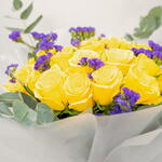 This beautiful bouquet combines 15 yellow roses and 10 blue statice flowers, creating a stunning contrast of warmth and calm. The yellow roses symbolize happiness and friendship, while the blue statice adds a touch of elegance and serenity. Together, they make a perfect gift to celebrate joyful moments and convey feelings of affection and tranquility.