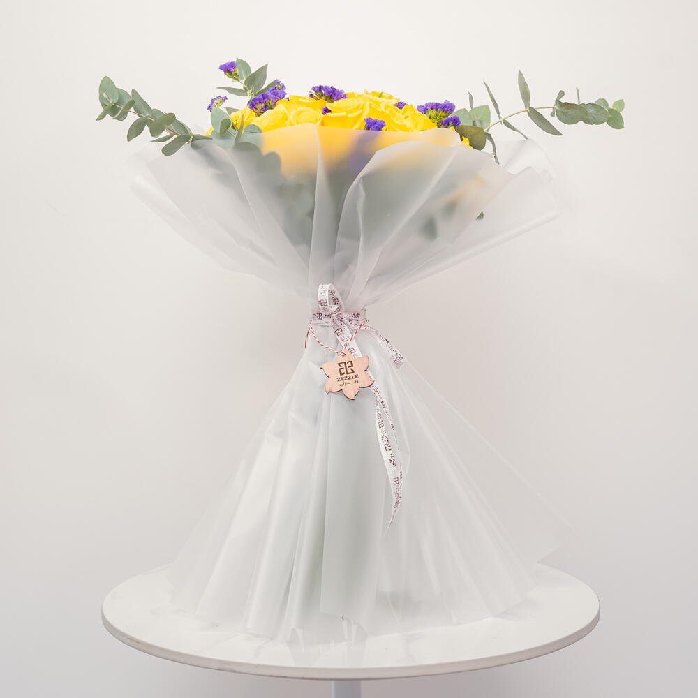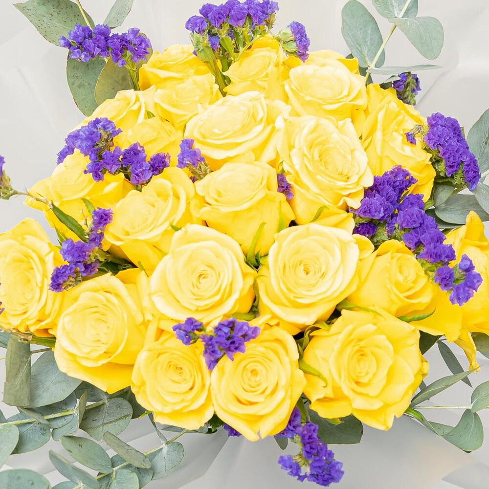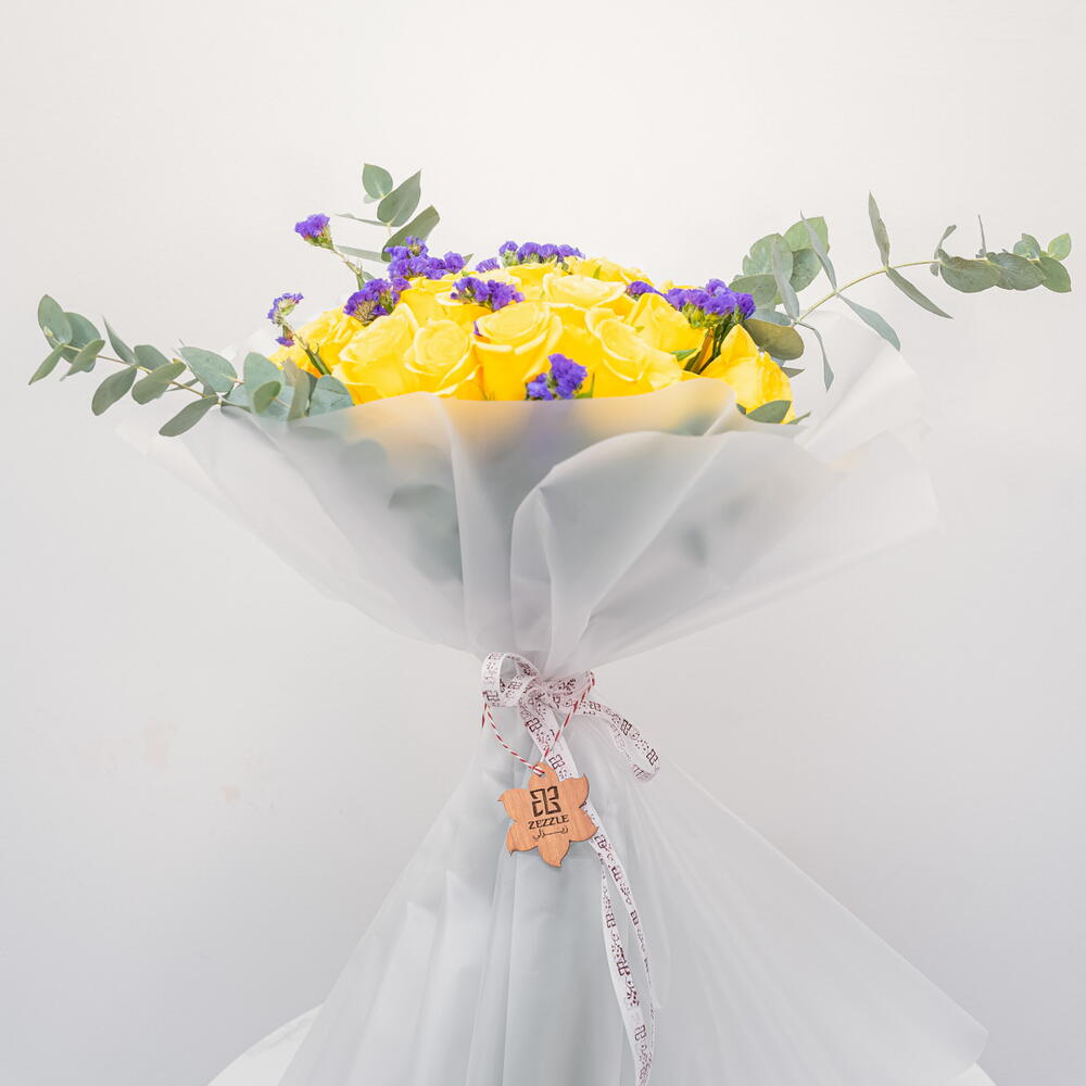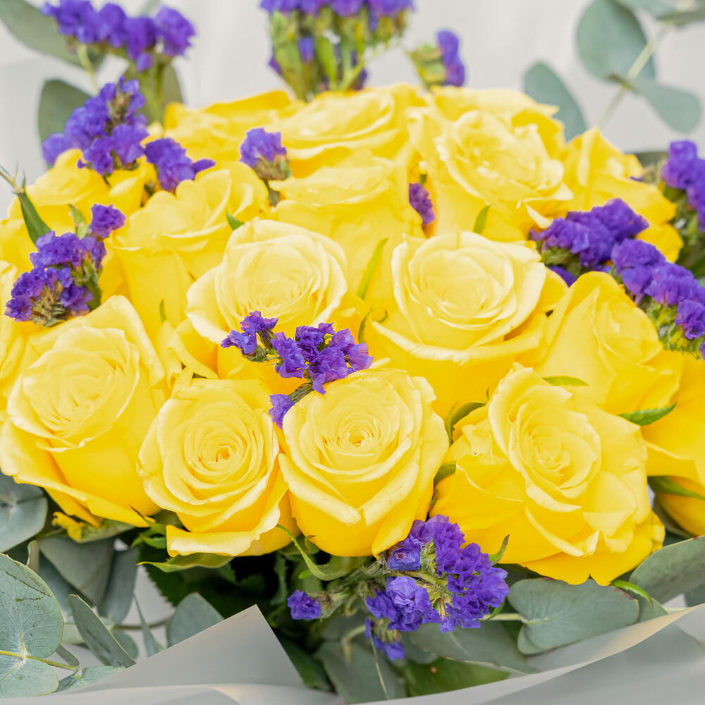 This beautiful bouquet combines 15 yellow roses and 10 blue statice flowers, creating a stunning contrast of warmth and calm. The yellow roses symbolize happiness and friendship, while the blue statice adds a touch of elegance and serenity. Together, they make a perfect gift to celebrate joyful moments and convey feelings of affection and tranquility.