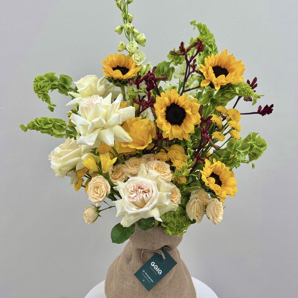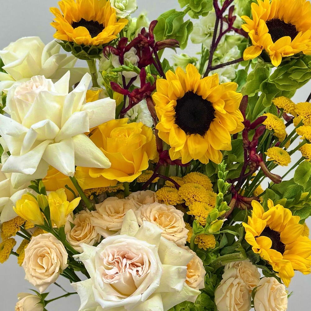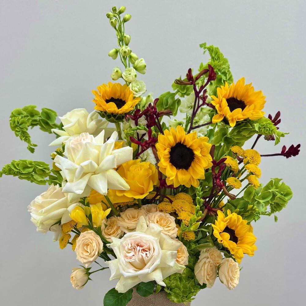 Bring the warmth of a summer afternoon indoors with this luxurious, high-energy masterpiece. We have curated a bold fusion of vibrant golden sunflowers and fragrant, creamy Ohara roses, balanced by the striking architectural height of Bells of Ireland and exotic kangaroo paws. 🌻💛 🌼 Best For: High-End Graduations, Get Well Soon wishes, Joyful Birthdays, or a vibrant Thank You gift. ⭐️🤩
