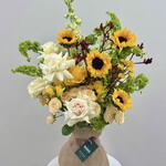 Eucalyptus - 4 pcs Spray rose - 3 pcs Sunflower - 4 pcs hydrangea green - 2 pcs rose yellow - 3 pcs delphinium - 2 pcs spray chrysanthemum - 3 pcs ohara rose - 4 pcs bells of ireland - 5 pcs kangaroo paw - 3 pcs