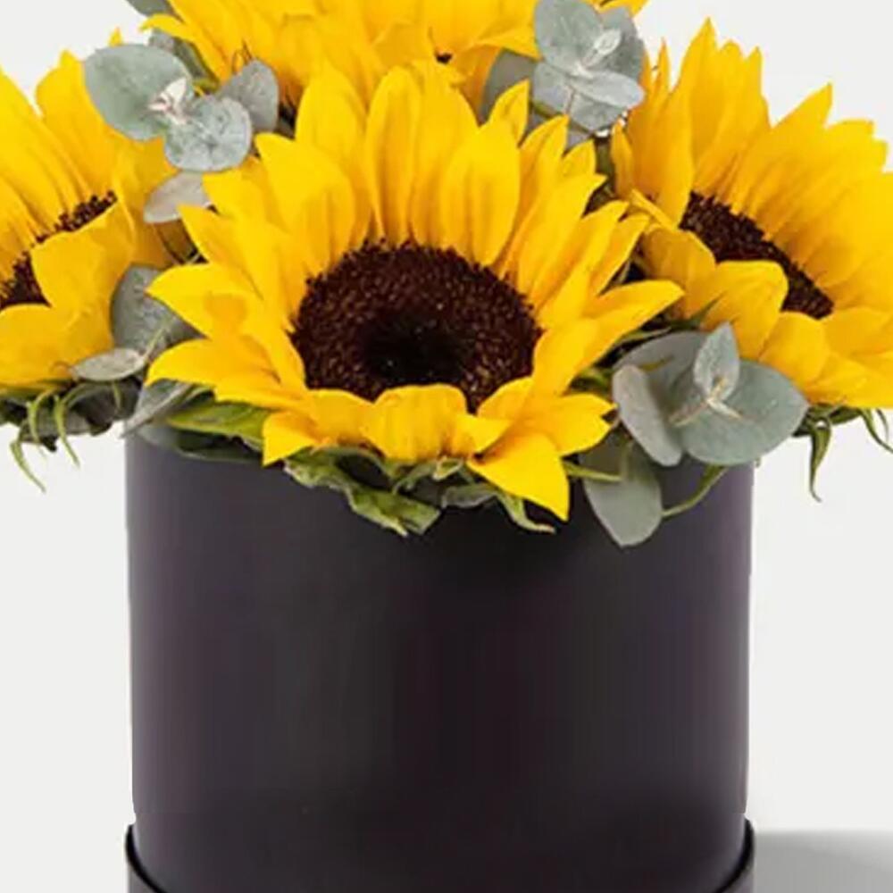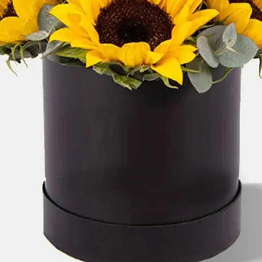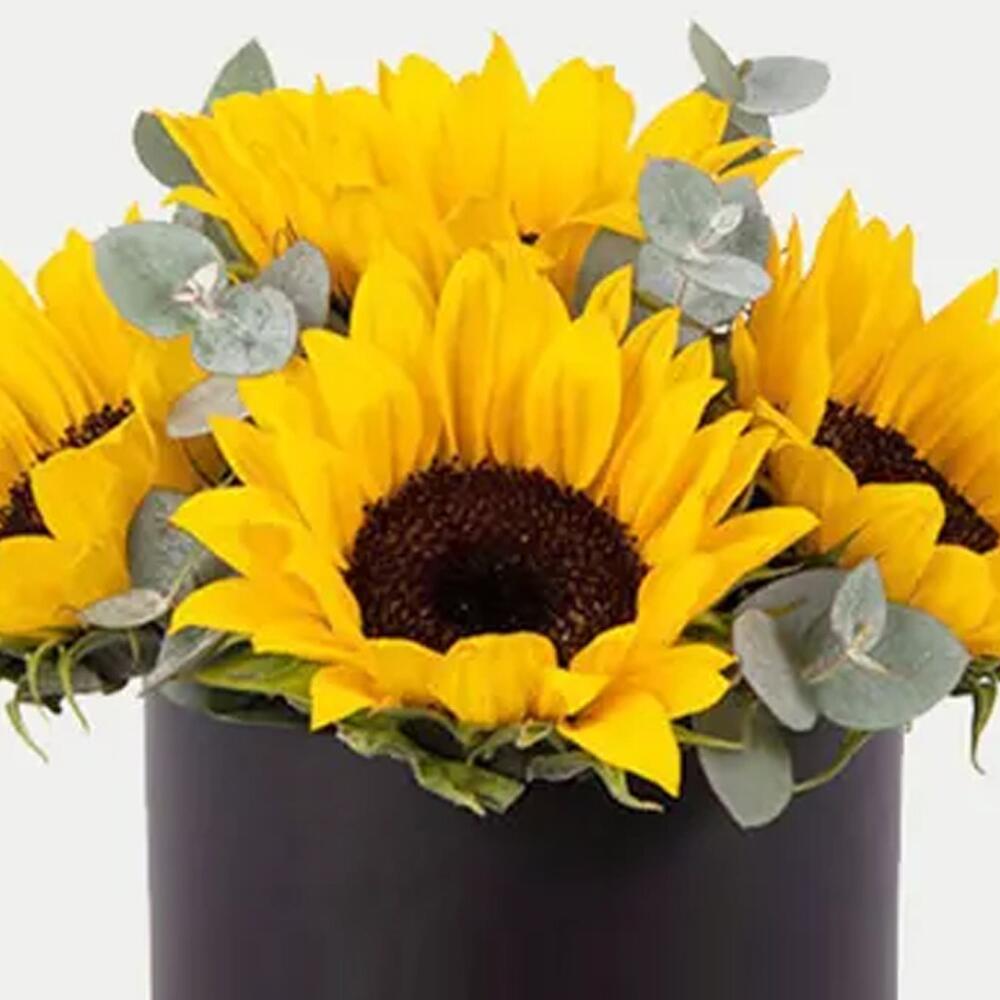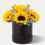 Five radiant sunflowers elegantly presented in a sleek black box, creating a striking contrast of bold beauty. Symbolizing happiness, vitality, and warmth, this arrangement is perfect for making a joyful statement while adding a touch of modern sophistication. Ideal for birthdays, congratulations, or simply spreading sunshine in style.