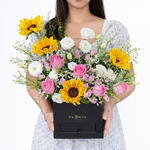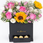 A radiant fusion of warmth and elegance, this stunning arrangement features bold sunflowers paired with soft pink roses and delicate eustoma blooms, creating a perfect balance of vibrance and grace. Accented with purple spray roses, white limonium, and airy lepidium, the design is enriched with natural textures and soft contrasts that elevate its overall charm. Nestled within the arrangement are premium Ferrero Rocher chocolates, adding a touch of indulgence to this beautifully curated gift. Presented in a sleek black square box, this luxurious creation embodies modern sophistication—making it an ideal choice for celebrations, heartfelt gifting, or making a lasting impression.