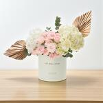 white hydrangeas - 2 pcs pink spray roses - 5 pcs eucalyptus sprigs - 3 pcs golden dried palm leaves - 2 pcs